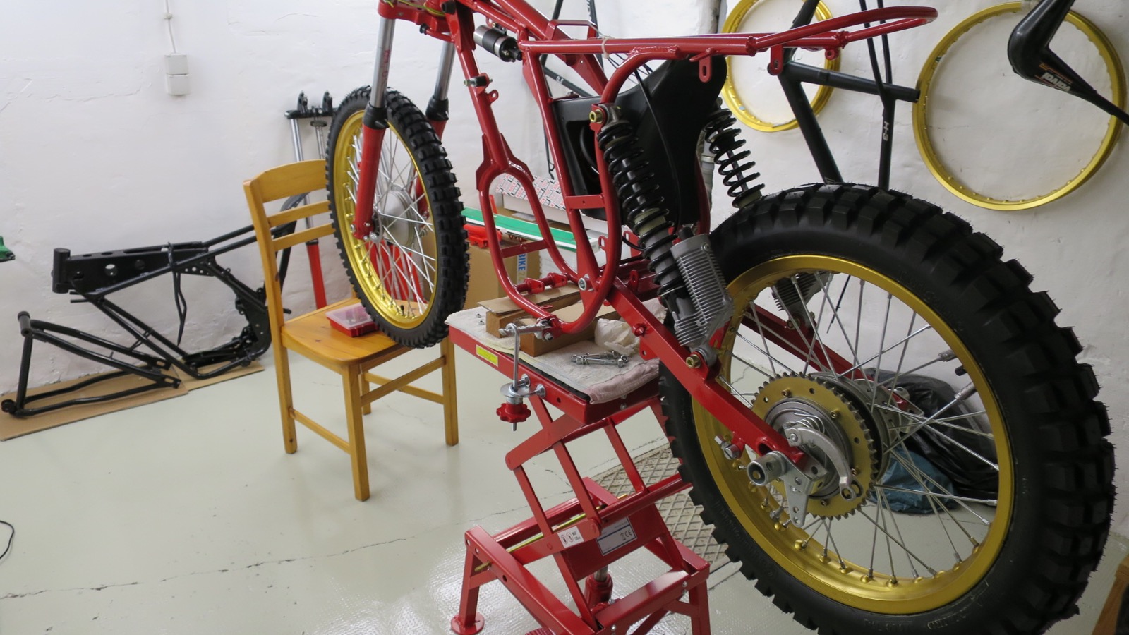 Der Stuhl war nur zur Sicherheit, hatte hinten alles abgebaut, Schwinge, Federbeine und das Laufrad, das ist das Gewicht schon sehr einseitig verteilt.