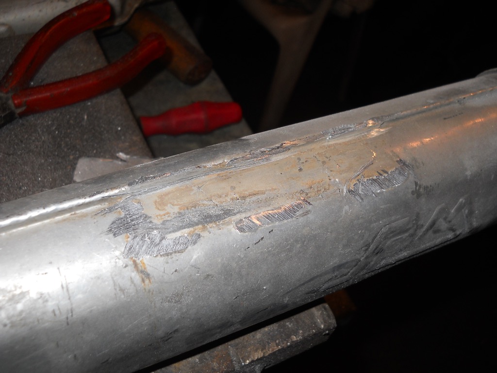 Dann die Schweißnähte so gut es ging mit der Fächerscheibe verputzt und mit Schleifpapier alles egalisiert.