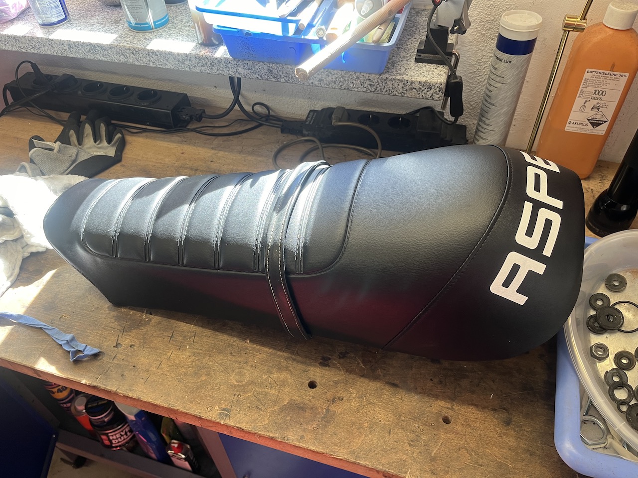 Das erste fertige Teil an der Aspes war übrigens die Sitzbank, hier hatte ich seinerzeit zeitgleich sowohl die Cimatti - als auch Aspes Sitzbank mit Kalles perfekten Repro`s schon beziehen lassen. Den Halteriemen konnte ich retten.