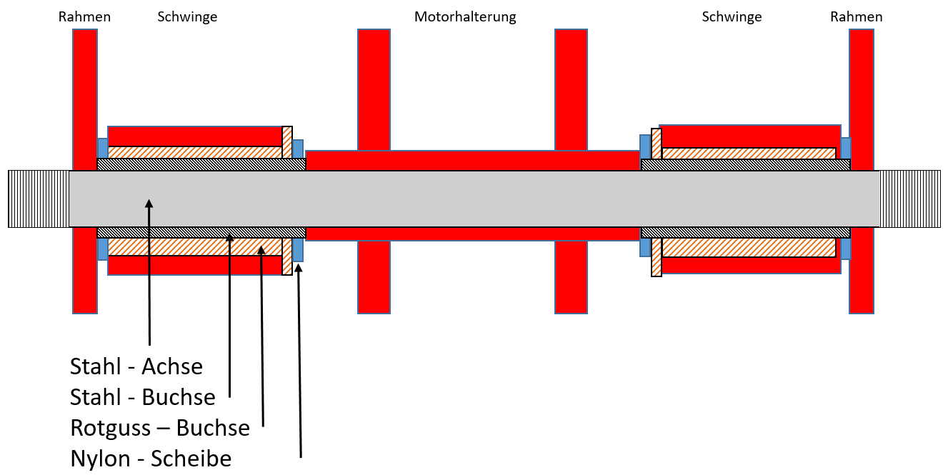 Wichtig ist, dass die Achse in Stahlhülsen läuft, die mit dem mittleren Motorhalter gemeinsam einen Kraftschluss zum Rahmen bilden, also minimal überstehen müssen. Auf der Achse dreht sich also nichts, also anders als z.B. bei Aspes, wo die Nadellager auf der Schwingenachse laufen un die deshalb sehr passgenau mit gehärteter Oberfläche sein muss.