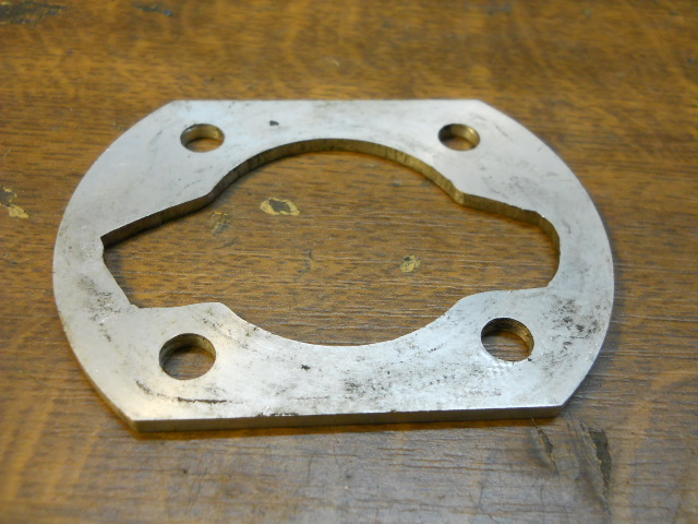 Wenn man jetzt diese Polini Logik kennt, ergeben sich noch viele Möglichkeiten. Selbst wenn der Zylinderfuß schon zu weit abgedreht wäre kann man eine entsprechende Zwischenplatte unterlegen. Sowas kann man mit ner Zylinderfußdichtung als Muster bei jedem Laserschneide Laden machen lassen in der benötigten Dicke. Die nachfolgend gezeigte Muster Zwischenplatte hat sogar mal jemand per Hand gefeilt, geht auch.