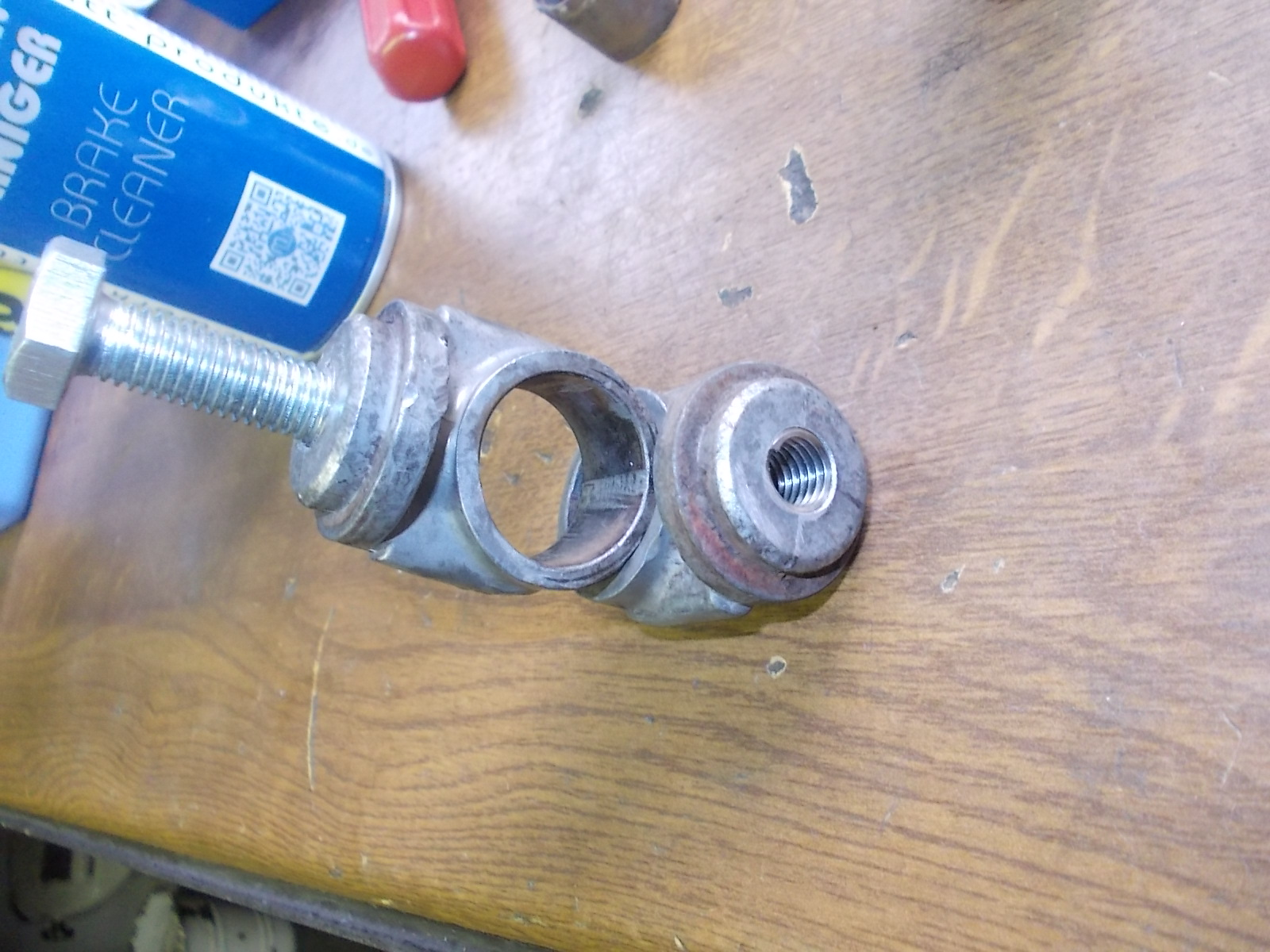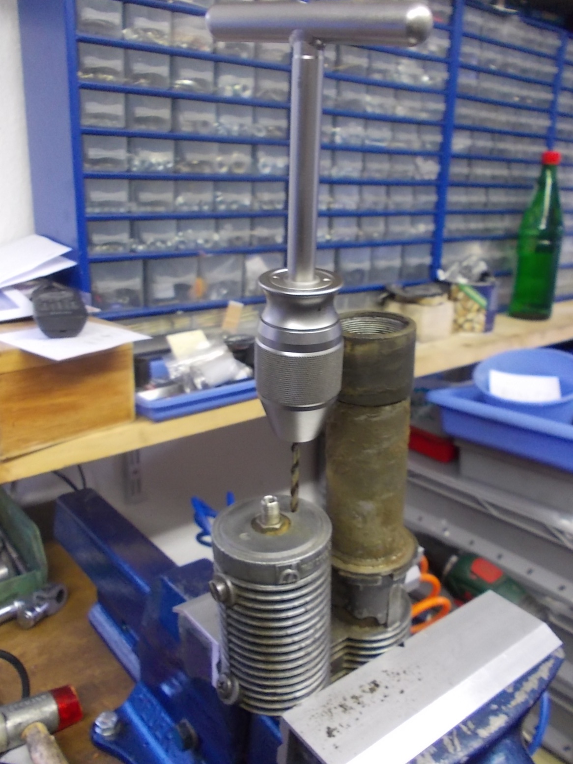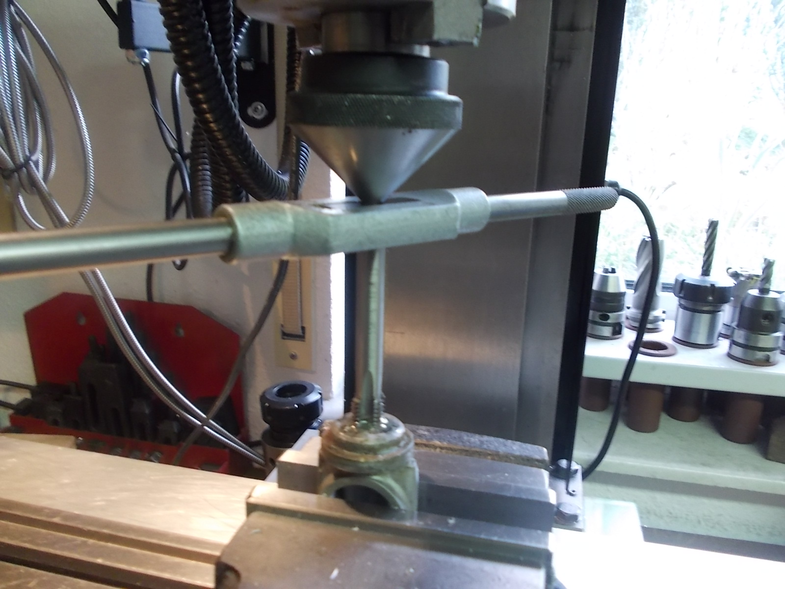 Gleich mal aus der Restekiste nen Führungsdorn zum ausrichten unter der Fräse gemacht. Passend ausgebohrt und lotgerecht ein Gewinde rein.