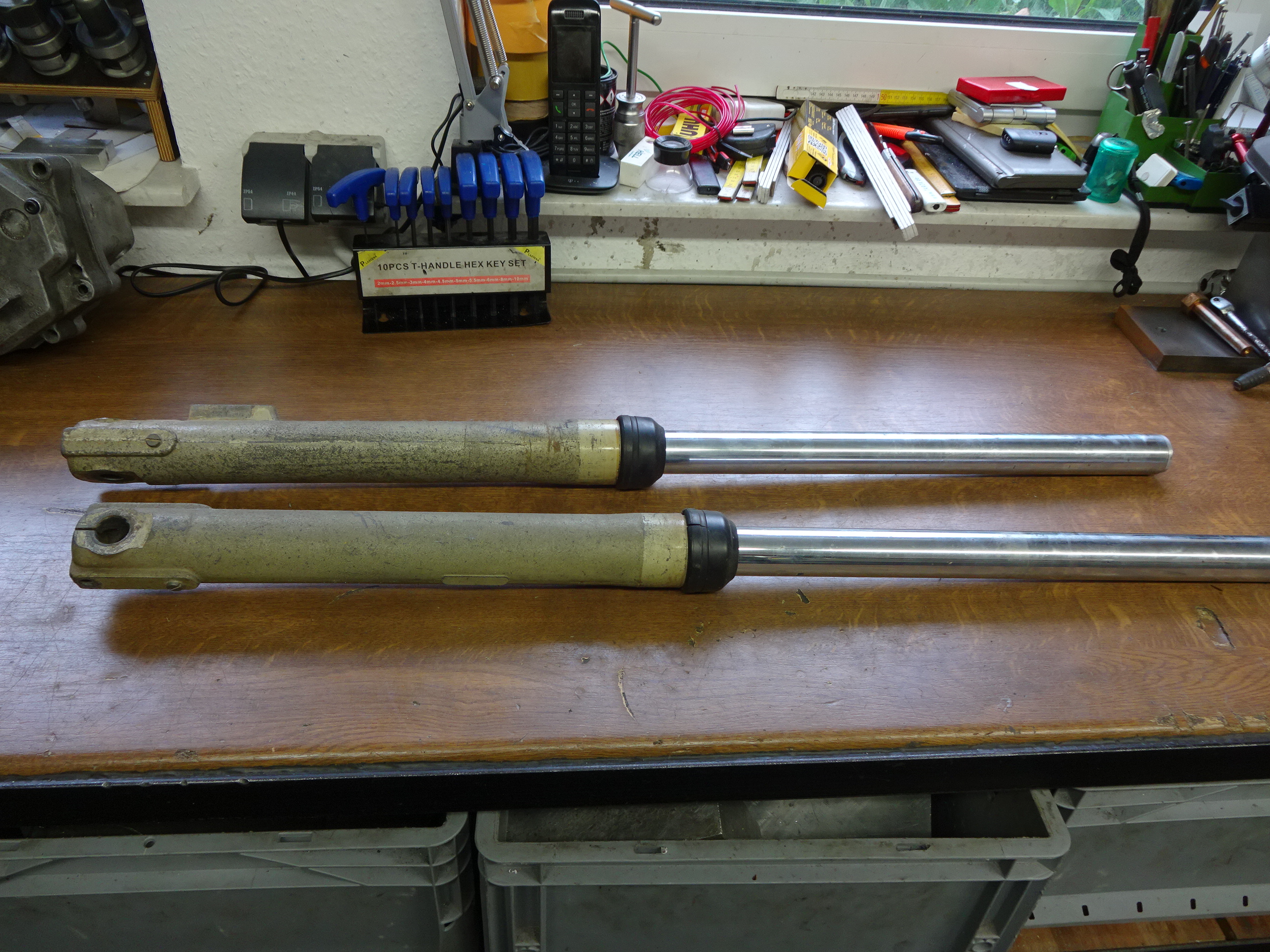 Denke ich mache mal nen separaten Beitrag dazu auf Da liegen die Gabelholme noch komplett auf dem Tisch. Dateianhang: Erst mal die Kappen abgemacht, haben ganz gut gelitten die Teile Dateianhang: Aber hatte ich nicht schon mal geschrieben, dass ich über die Jahre Teile für die Gori zusammengetragen habe Dateianhang: Naja die Standrohre muss ich wohl zu Wissing geben. Die Macken sind alle im Laufbereich und auch sonst ist die Oberfläche nicht mehr so toll. Aber gerade sind die Standrohre, laufen schön gleichmäßig nebeneinander, keine Lichtspaltänderung Dateianhang: Dateianhang: Ja und dann hab ich mal ein neues 20 Euro Werkzeug für den Ausbau der Wellendichtringe ausprobiert. Ich muss sagen, genial Dateianhang: Dateianhang: Dateianhang: Man muss erst mal ein wenig experimentieren wie hoch oder tief man das Tauchrohr im Schraubstock einspannt damit das Werkzeug gut arbeiten kann. Hat man aber nach ein paar Minuten schnell raus. Der obere Ring geht superschnell raus. Beim unteren hab ich nachher einfach mit nem Hammerstiel die Hebenase gegen den Ring nach außen gedrückt und sofort ging alles prima. Das geht so was von samt und seidig, wenn ich da an früher denke Kalle |