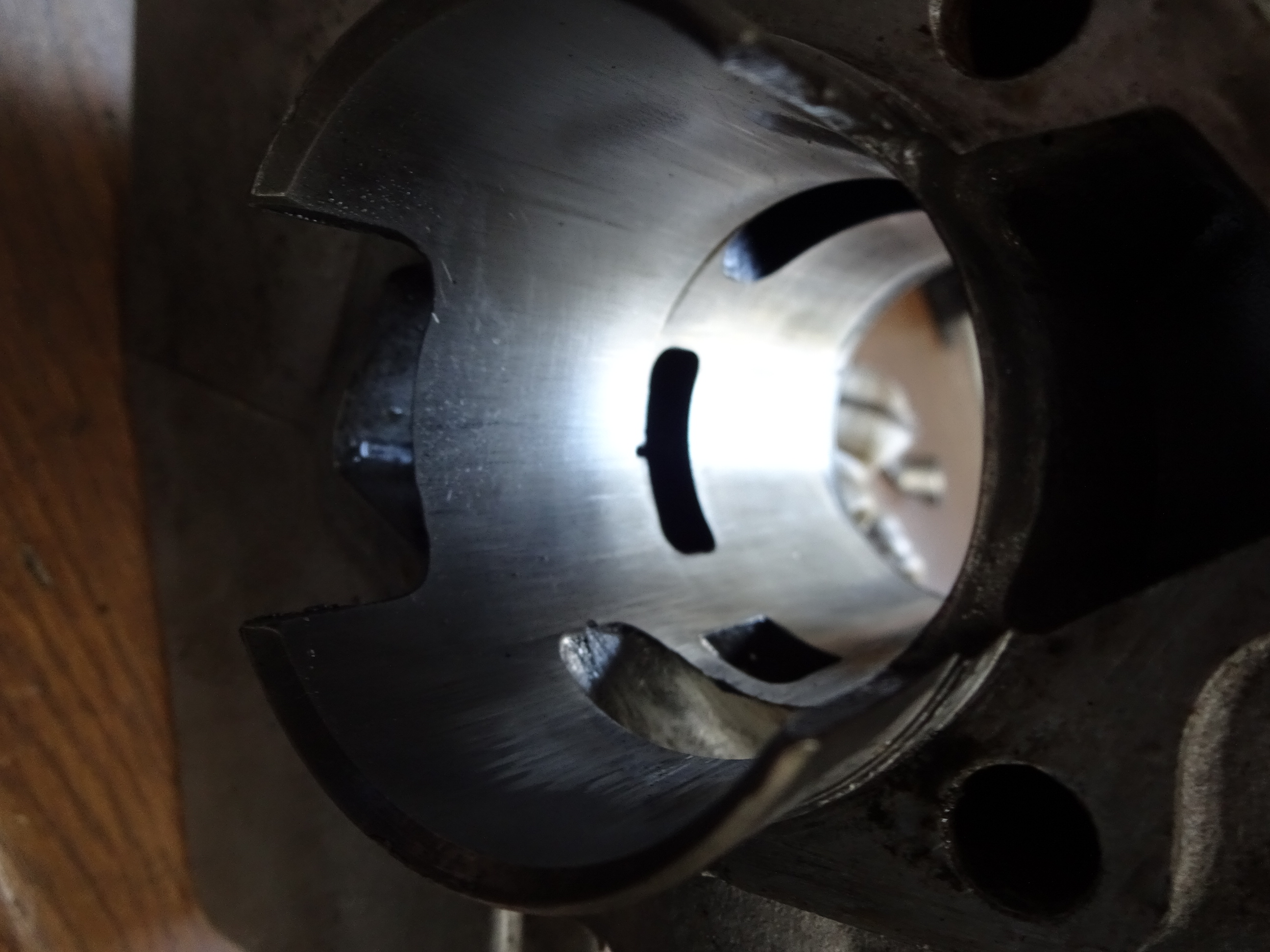Der Zylinder hat es hinter sich, Einhakspuren an den Kanälen und großflächig Chrom verschlissen. Muss neu beschichtet werden mit neuem Kolben.