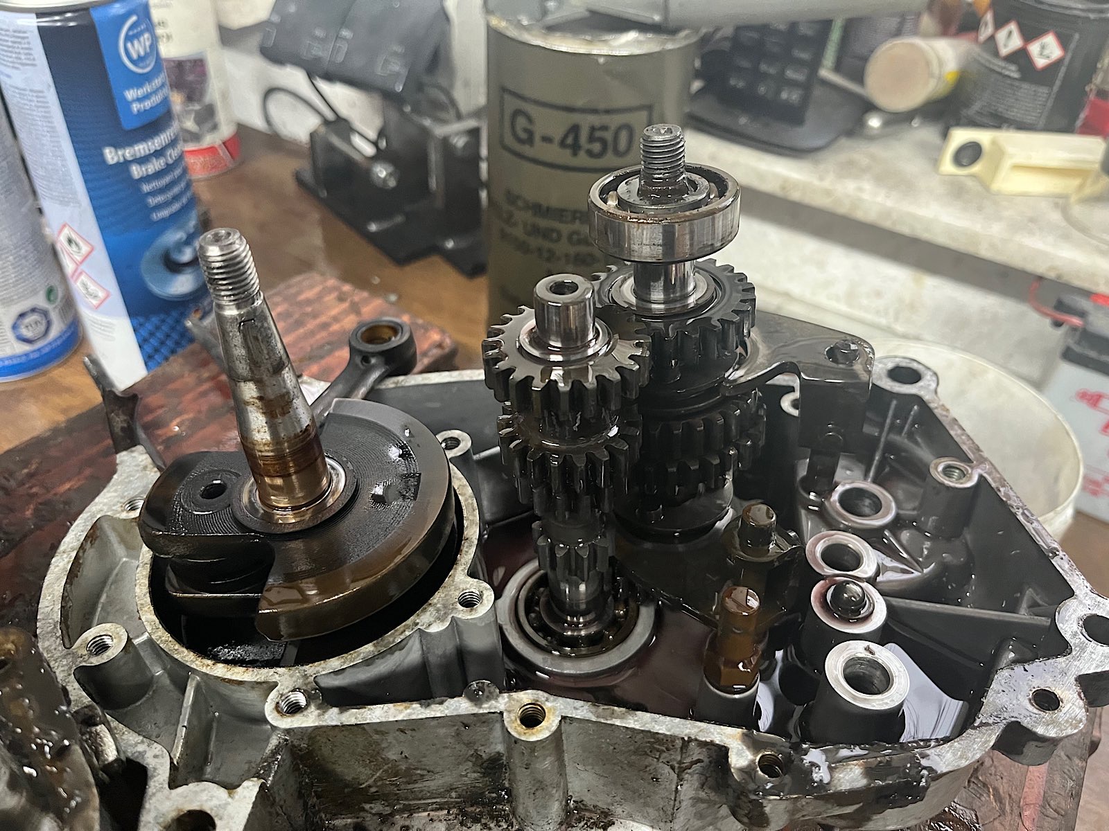 Beim ablassen des Getriebeöls zeigte sich, das wohl auch einiges im Kurbelgehäuse war. Denke da hat sich ein Dichtring verabschiedet und der Motor hat Getriebeöl gesagt. Erklärt auch den „ angebrannten“ Kurbelraum auf weiteren Bildern