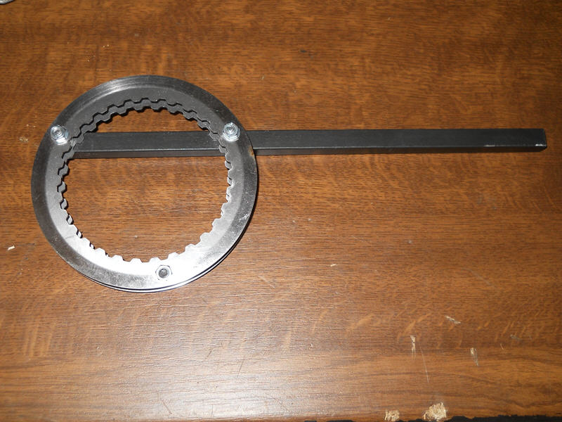 Einfach ein Eisen nehmen /ca. 1,5 bis 2cm und zwei Kupplungsscheiben drauf. Vorher natürlich im Kupplungskorb ausgerichtet. 2 Löcher durch alles (inkl. 2.Scheibe) bohren und mit Distanzstücken (hier Muttern) verschrauben. Dann noch auf der gegenüberliegenden Seite ein Distanzstück rein und fertig ist das Werkzeug.