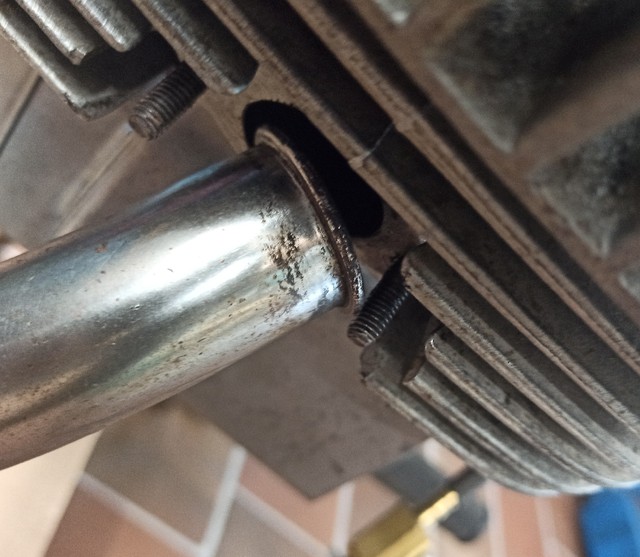 Problem: der zum Stahl-Zylinder passenden Krümmer wurde mit einer Überwurfmutter befestigt. Der N2052 hat einen Auslass mit ca. 29,3 mm und 2 M6 Stehbolzen (Lochabstand ca. 48mm). Da hätte ich den Krümmer mit einem Überwurfflansch befestigen wollen, aber leider passt der Winkel zwischen Krümmer und Auslass nicht.