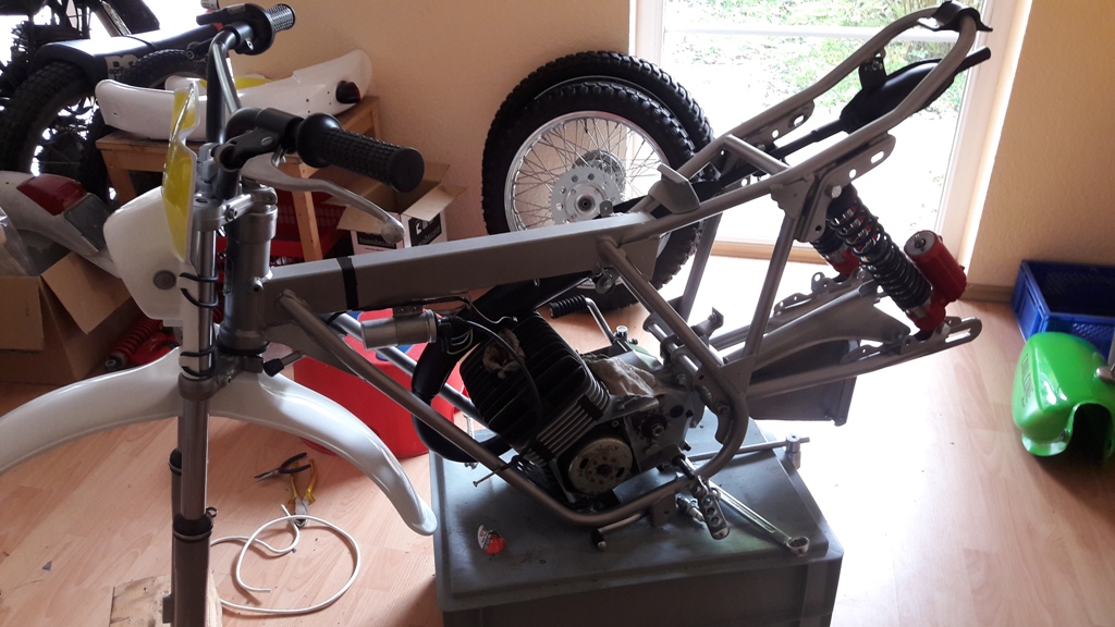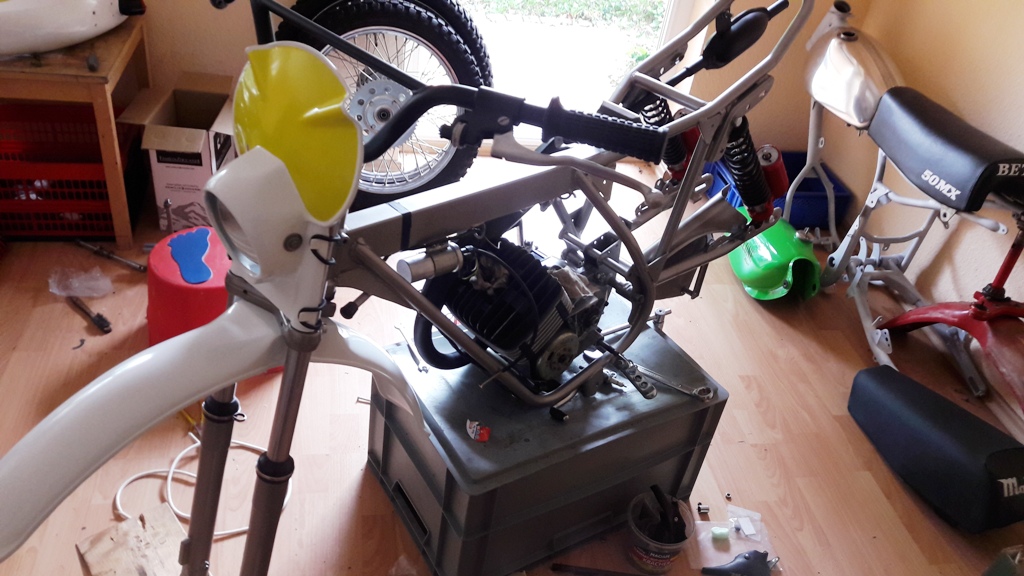 Malaguti, alte Liebe. Ich war Ronco-Fahrer, allerdings ist die Cavalcone aus den 70ern die schönste von allen - wie ich finde (hat ein wenig von Ancillotti). Nach den Aspes-Restaurationen habe ich mir meine persönliche Mala zusammengestrickt. Dabei sind Jahre ins Land gezogen. Originalteile gesucht, aber nicht Originalbaujahr und Farbe und Motor. Man möge mir verzeihen. Rahmen BJ 78 mit Ori-Gutachten ohne Vergasereintrag. Schwinge Chopper, BJ81, hatte nichts anderes. Habe ich erst beim Zusammenbau festgestellt. Zu breit – Nase für Bremsanker verlängert. Passt. War ärgerlich, auch der Auspuff hat sich gewehrt, ging aber auch dann. Stoßdämpfer alte Marzocchi (passt gar nicht in die BJ, aber schön), 6-Gang-Motor mit 70ccm und 19er, kontaktlose Zündung. Grün musste der Tank werden. Alles andere ergab sich, ein Kampf, wie sich herausstellen sollte. Letztlich wurde es der 79er Tank (zu faul, um separate Entlüftung dran zu machen), die älteren haben eine separate Entlüftung, sehen aber sonst genauso aus, die 79er Bank (habe kürzlich noch eine gaaannz seltene Ein-Mann-Sitzbank gefunden, Foto), die 78er Zwei-Mann-Sitzbank ist zu eckig für meinen Geschmack, dann bin ich von schwarzem Plastik auf weißes umgeschwenkt. Sieht besser aus. Auch die kleinen Deckel (78) sind gefälliger als die großen 79er. Kotflügel 78er mit Aprilia-Rücklicht, Maske nicht original, aber ähnlich, Licht 79er Modell (Schalter am Scheinwerfer), 78er Modell hat Aprilia-Schalter am Lenker und Aprilia-Scheinwerfer. Domino-Hebel mit Rädchen (schön, aber nicht Ori soviel ich weiß), einige NOS-Teile: Rasten, Bremshebel, Kettenspanner. Habe auch San Remo-Felgen gefunden (sehr selten). Sollten erst Akront werden. Aber seht selbst die Verwandlung. Die Kleine wird höchst wahrscheinlich Deko werden oder vielleicht im Frühjahr wachgeküsst. Zündfunke alles da. Mal sehen. Fehlen nur noch Kette und Züge. Euch was aufgefallen? Ja. Mir am Ende auch. Ich habe intuitiv die Farben der italienischen Flagge gewählt. Warum nur? Vielleicht ist sie auch ein wenig zu bunt geraten. Egal, mir gefällt´s. Ein paar unsortierte Bilder von der Entstehung.