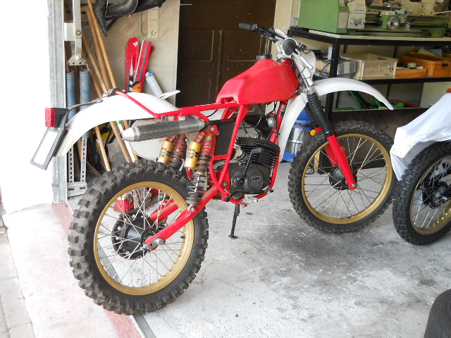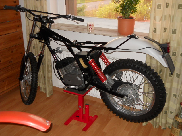 Ist im Moment mit Öhlins Federbeinen versehen (aus meiner 175er KTM geklaut :roll: ) und hat mittlerweile goldene Akrontfelgen.