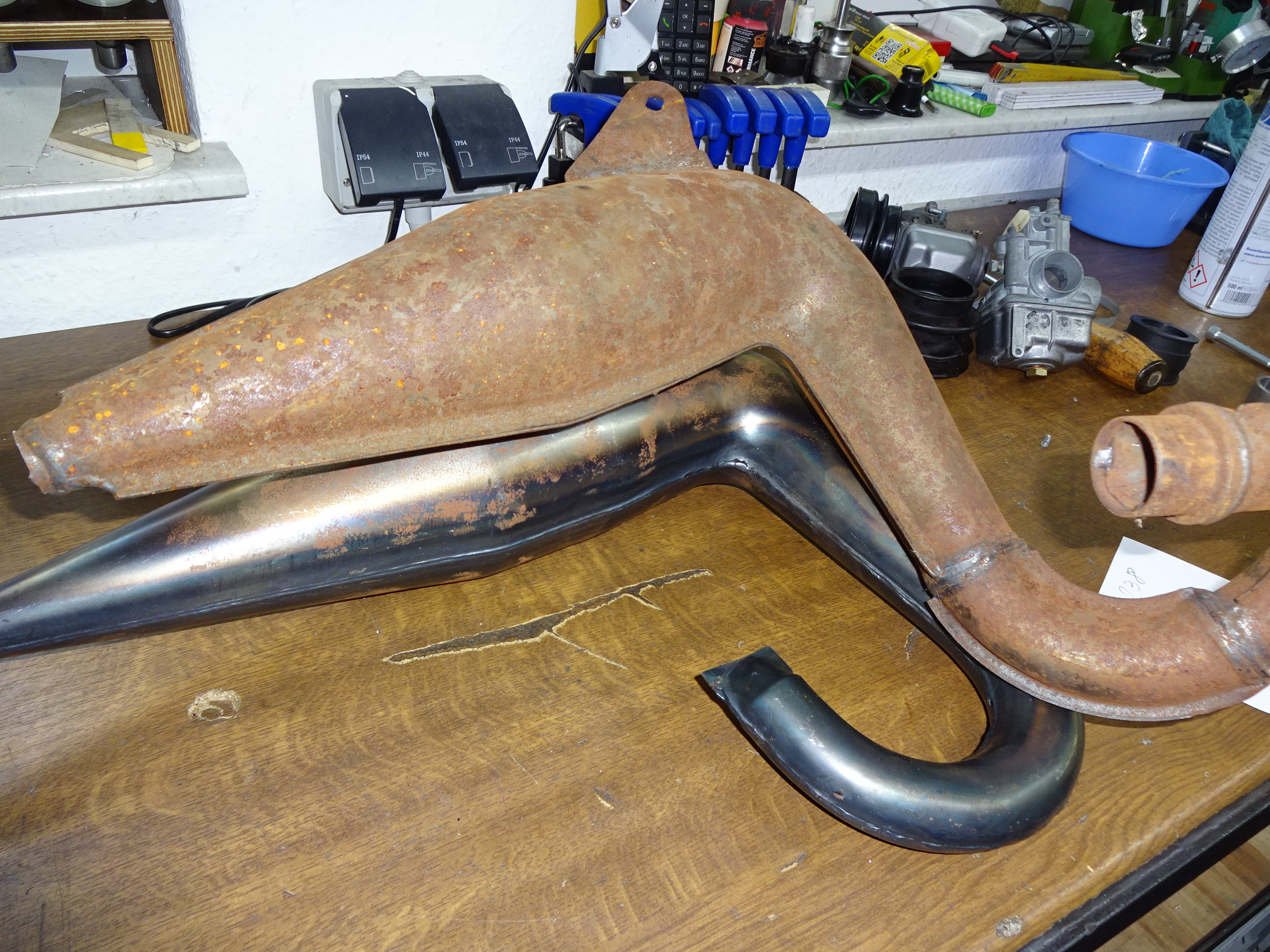 Erst mal den Auspuff am Moped geheftet, abmontiert und fertig geschweisst.