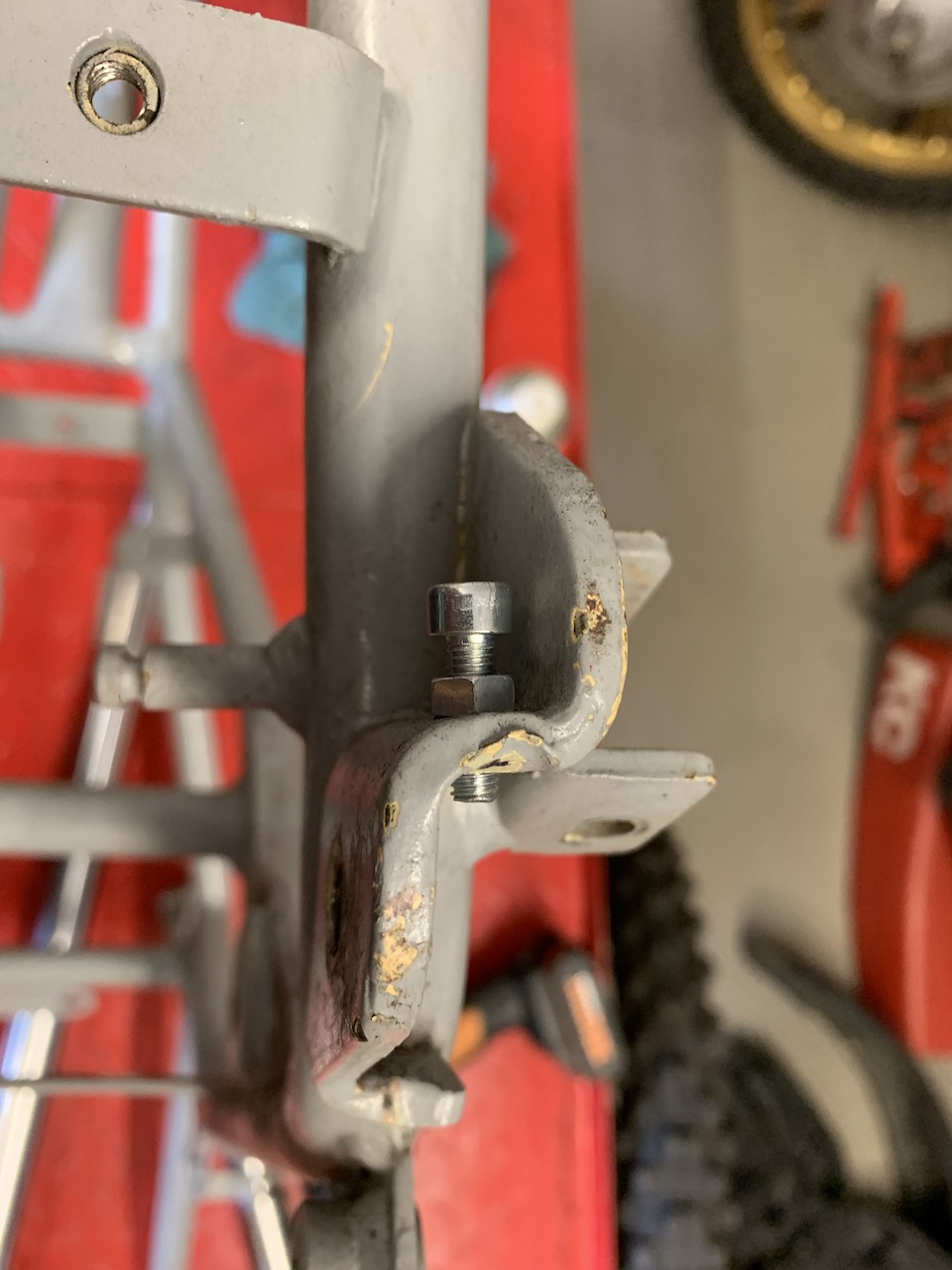 Am Rahmenrohr musste zur Tankbefestigung ein U-Profil angeschweißt werden, am Ständer wurden Stellschrauben angebracht, damit das Moped vernünftig und gerade steht. Kalle, Danke für die Hilfe!!