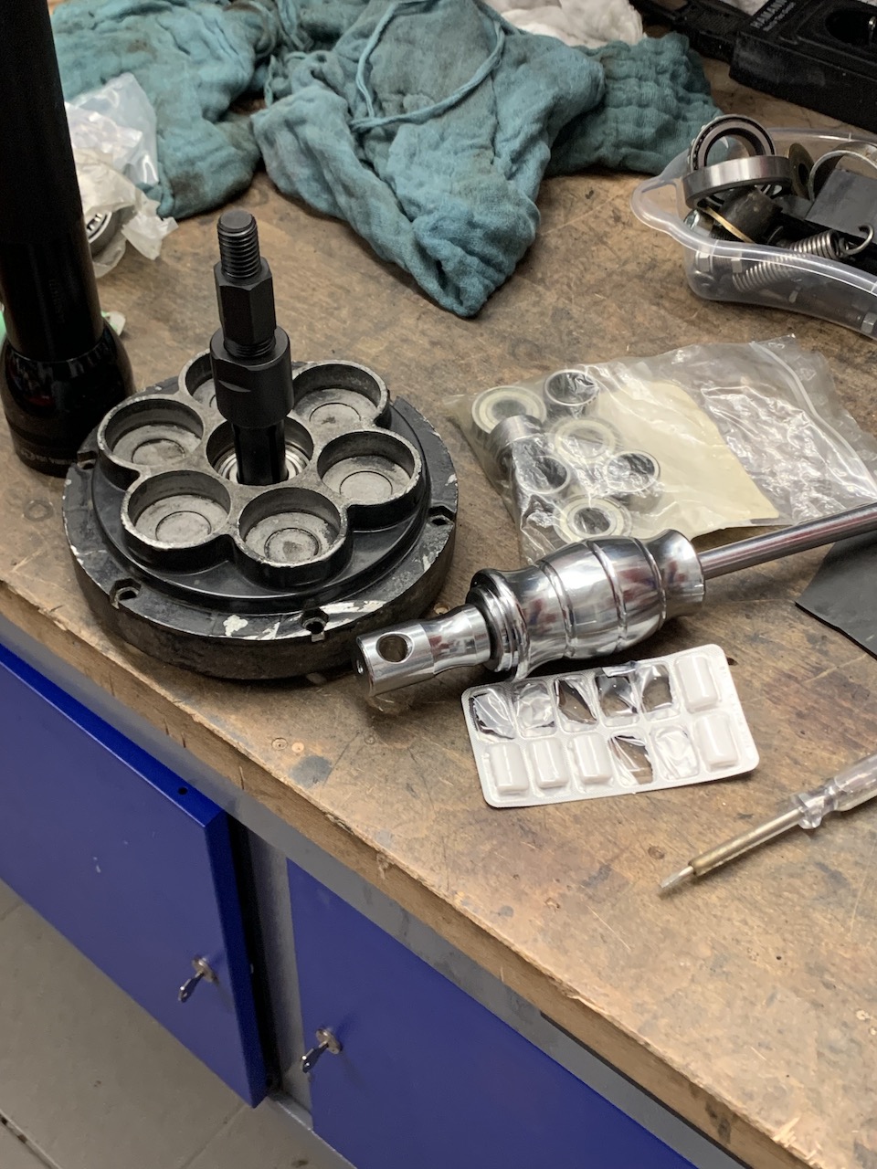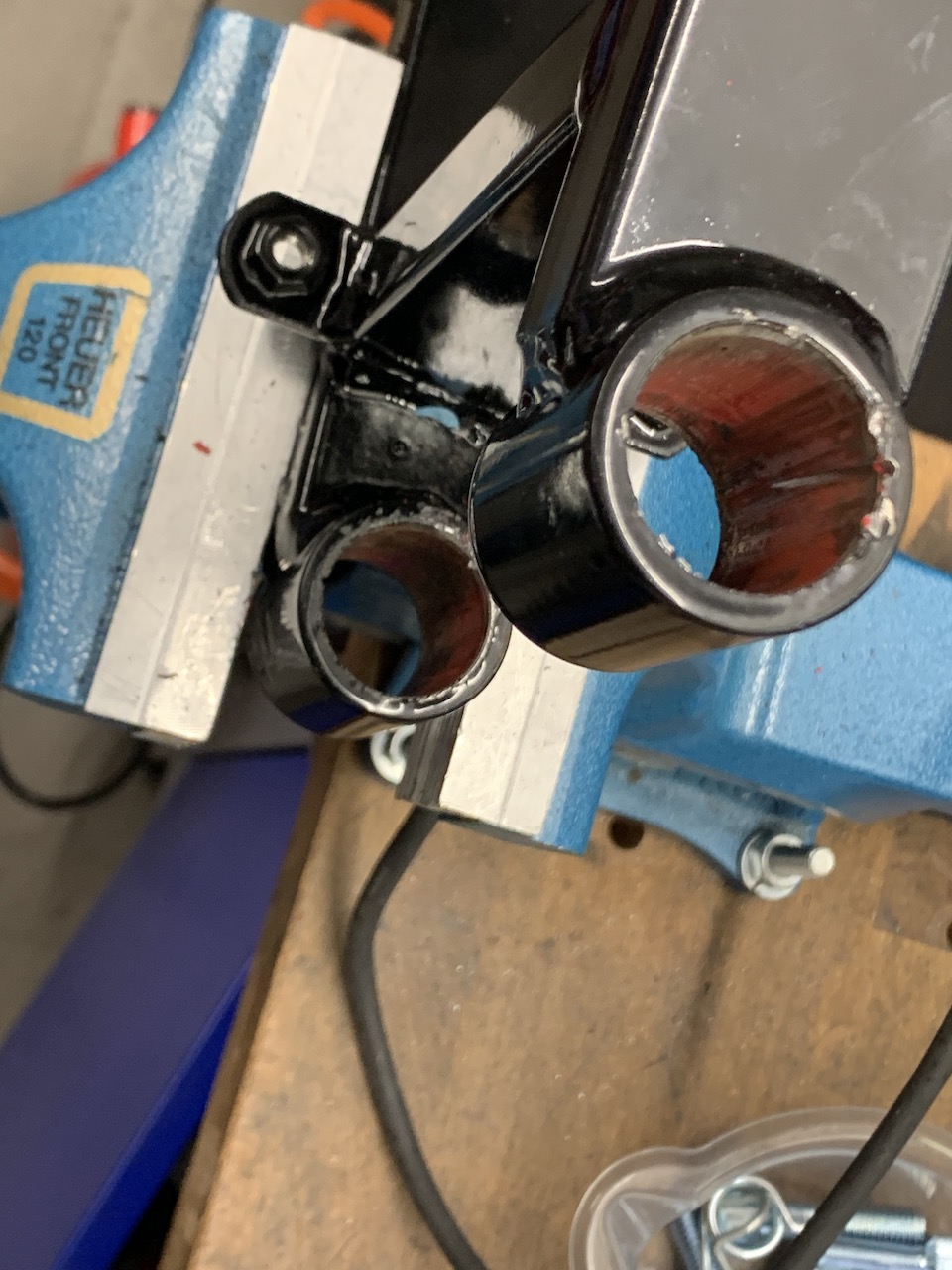 Aktuell beim Zusammenbau, die Schwinge wurde statt mit diesen Messingbuchsen mit originalen Silentbuchsen bestückt, Lenkkopflager erneuert, revidierte Gabel mit Vorderrad ist drin, der Rest geht nun hoffentlich deutlich zügiger voran.