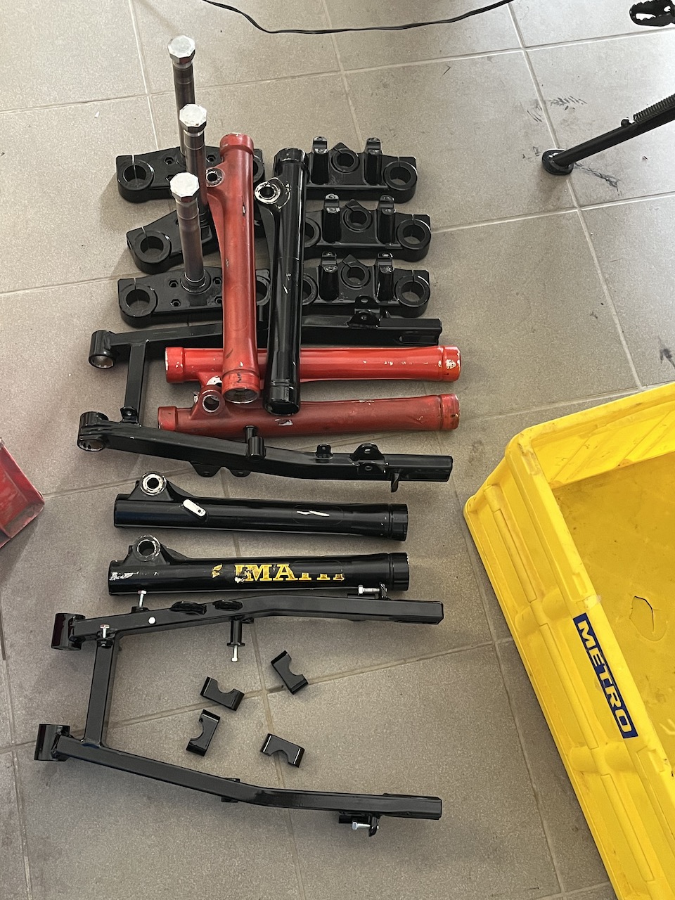 Hatte ja schon zuvor geschrieben, dass ich im Laufe der Jahre einiges an Cimatti Teilen gesammelt habe, deshalb dann auch direkt sämtliche Gabeln und Naben zerlegt und zum Strahlen und Pulvern fertig gemacht, die anderen Metallteile natürlich auch einschließlich Verzinken