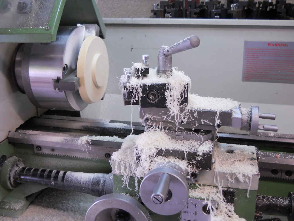Da hab ich mir ein recht großes und passendes Teil genommen und auf der Drehbank erst mal den einen Kreisanschluss gedreht. Man kann sehen das gearbeitet wurde