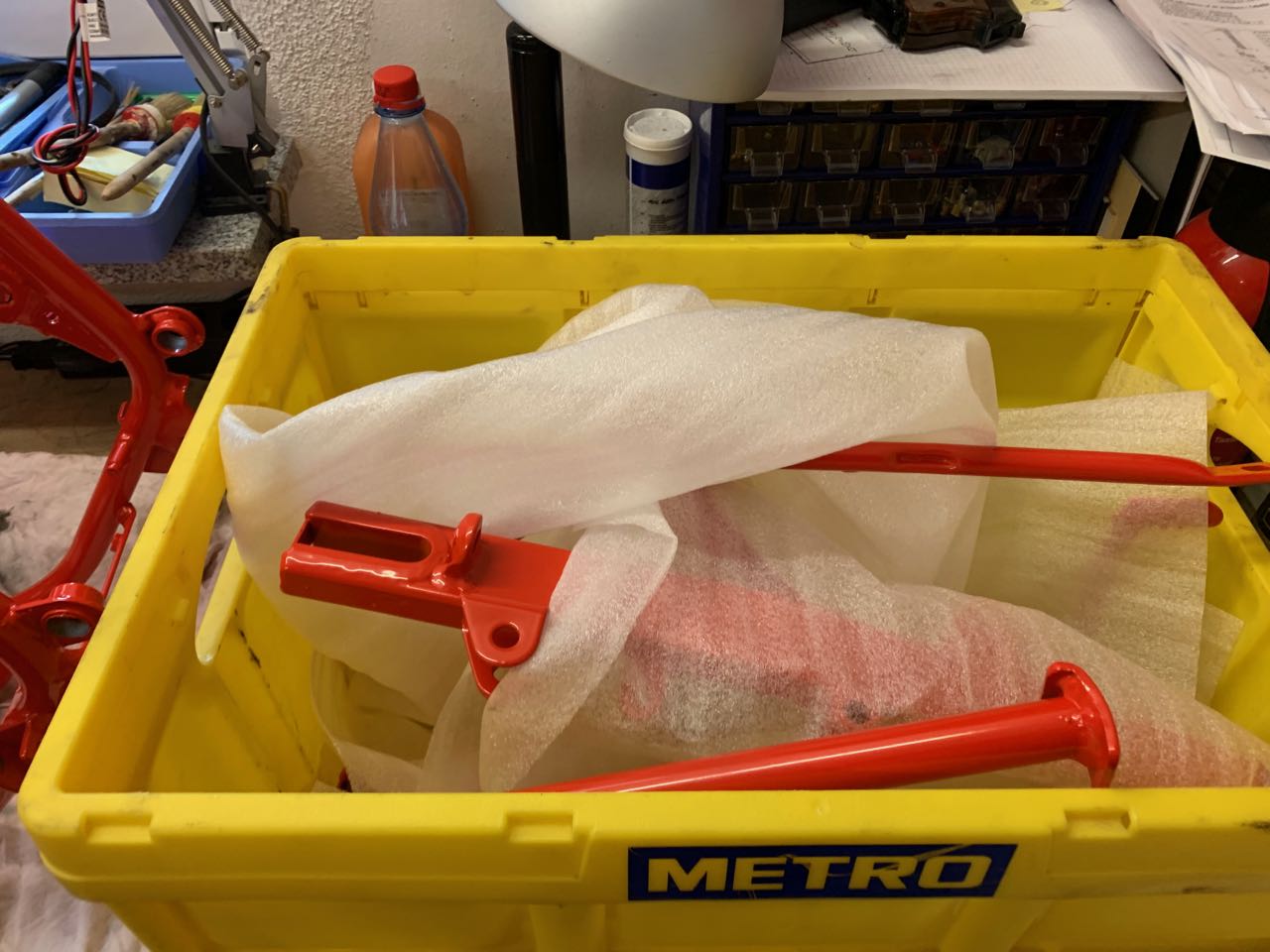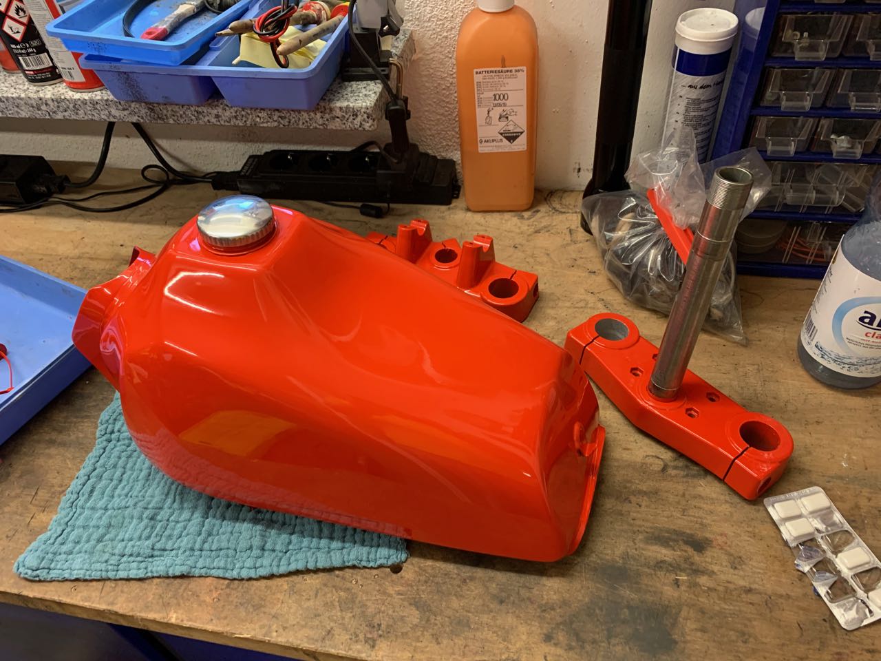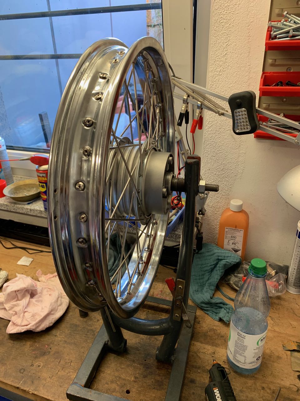 Um es abzukürzen, insgesamt vier Anläufe gebraucht, bis ich die Speichen drin hatte, begleitet von wildesten Flüchen und puren Zerstörungswünschen sämtlicher Gegenstände in meiner Werkstatt. Ist aber natürlich alles ganz geblieben, die Aktion hat mich aber echt Nerven gekostet, vielleicht doch nicht so gut beim Workshop aufgepasst.