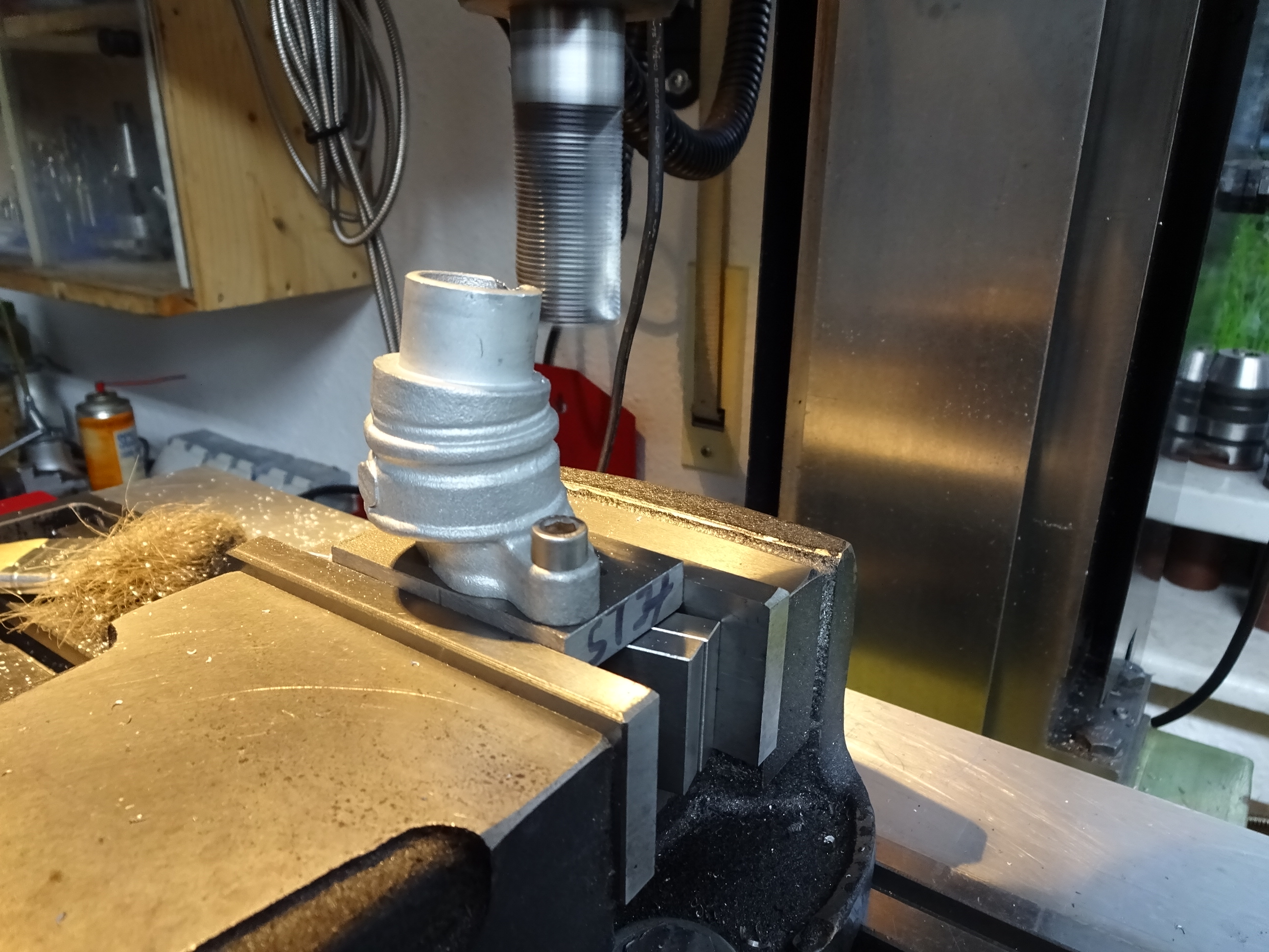 Hm in die Drehbank spannen, nicht so dolle und einfach so kann ich den auch nicht auf die Fräse spannen. Also Hilfshalter erstellen, damit ging es perfekt.