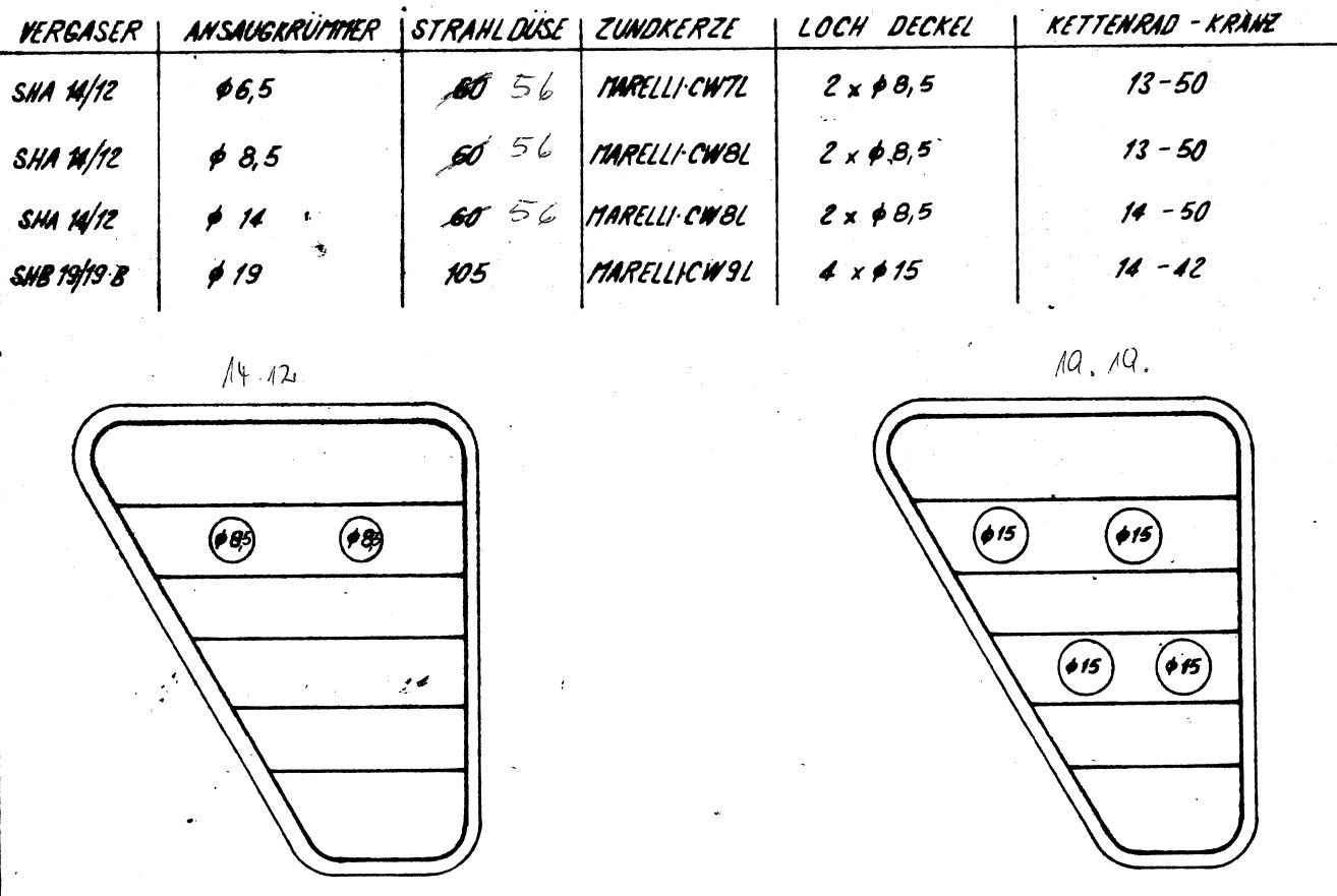 Ja ich habe den 14er Vergaser mit 58er HD, 14er Ansaugstutzen und 4xØ15er Löcher im Deckel. Damit bekam sie zu viel Luft und ich habe angefangen die Löcher mit den Fingern zu zu halten. Mit einer Öffnung ist sie dann gelaufen im Standgas und konnte auch die Leerlaufdüse wieder etwas rausdrehen. Hatte vorher die 56er drin wie beschrieben und damit lief sie nicht sauber im Leerlauf bei voll eingedrehter Schraube.