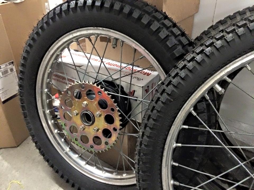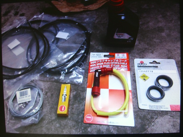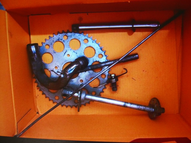 Nun mache ich sie schön. Hab erst mal alles zerlegt und gereinigt, wobei sich Petroleum mit Zahnbürste sehr bewährt hat. Erstaunlich war, dass überall noch die Originalschrauben verbaut worden, großteils sogar noch gelb verzinkt leuchtend !Hab alle Bowdenzüge, Bremsbeläge, Reifen, Schläuche, Hebel, Griffe, Lenkkopf-Radlager, etc. neu geordert. Gabel neue Simmerringe und Öl rein (es war auch keins mehr drin). Stoßdämpfer zerlegt. Dann Rahmen, Schwinge, Federn zum Pulvern gebracht: Verkehrsrot RAL 3020 und die Fußrasten, Ständer, Auspuff, etc. werden schwarz gepulvert. Krümmer neu schutzverchromt und viele Teile neu gelb verzinkt. Sitzbank neu bezogen. Die Plastics hab ich mit einer Poliermaschine aufgearbeitet. Schutzbleche habe ich Reproteile bekommen und sogar noch ein neues Originalrücklicht.