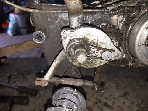 Besonderheit ist die Schaltung rechts. Schema...Leerlauf ganz unten, die vier Gänge nach oben. Elends lange Schaltwege. Das System ist auch krass. Die Schaltwelle kommt unter dem Motor raus und geht über zwei Umlenkstängchen nach rechts unter den Seitendeckel. Da sitzt eine Art Schaltautomat, der ist glaub ich nur für die Länge des Schaltweges und das Rasten zuständig. Klingt komisch, ist aber so