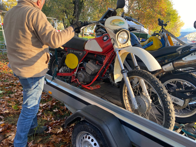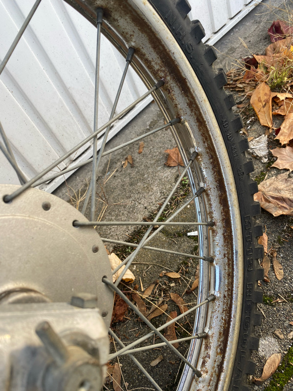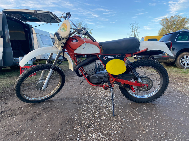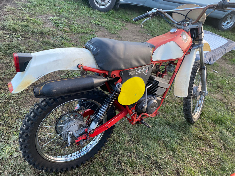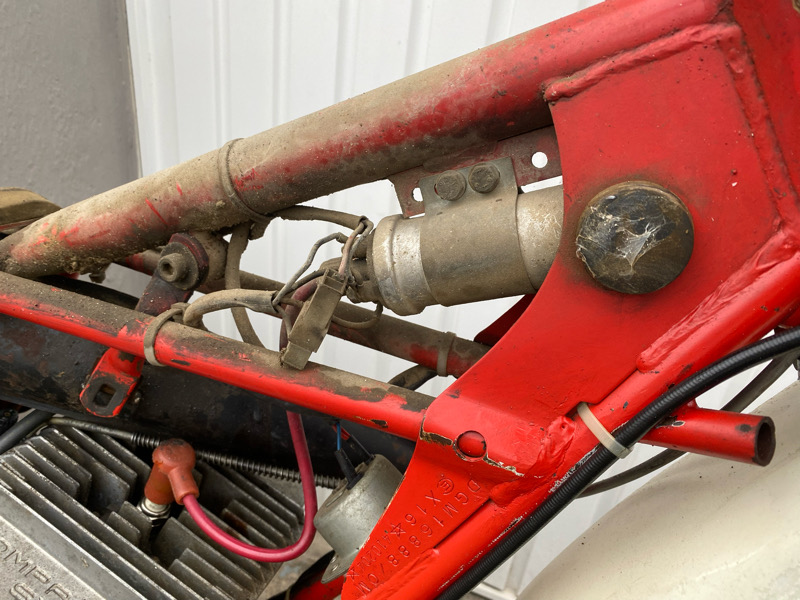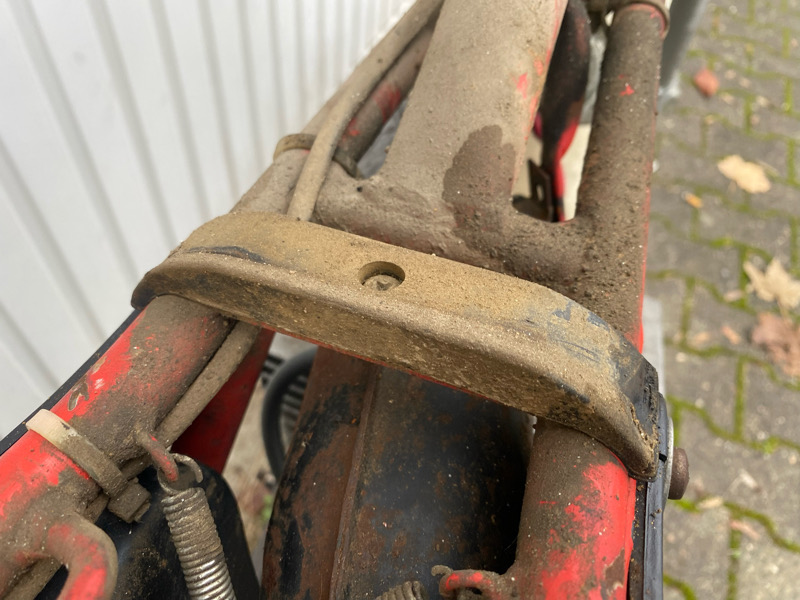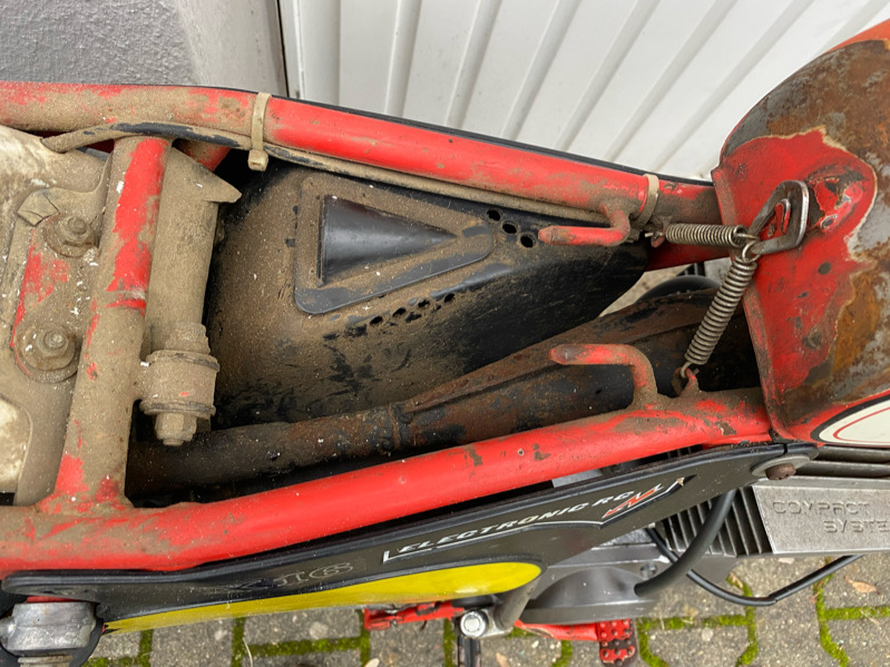 Bestandsaufnahme fiel nicht schlecht aus. Das schöne ist, alle wichtigen Teile sind dran, z.Bsp. Auspuff komplett, oder auch die Federbeine. Da dachte ich erst, die gehören da nicht dran, weil die so nach Trial aussehen. Im Prospekt verglichen, passt das aber.
