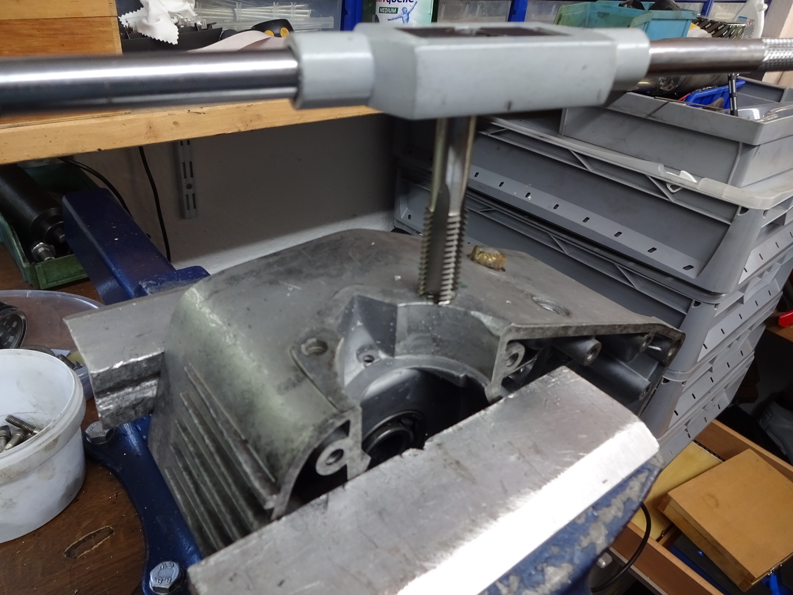 Da war aber wohl mal ein M7 Stehbolzen Gewinde defekt, also hat man da einen Einsatz reingebracht. Wäre ja alles OK, aber leider nur M6 und das noch aus Hartmetal. Keine Chance mit HSS Bohrer da auch nur anzukratzen. OK hab ja Hartmetalbohrer, leider nicht in allen Größen (dazu fehlt der Lottogewinn