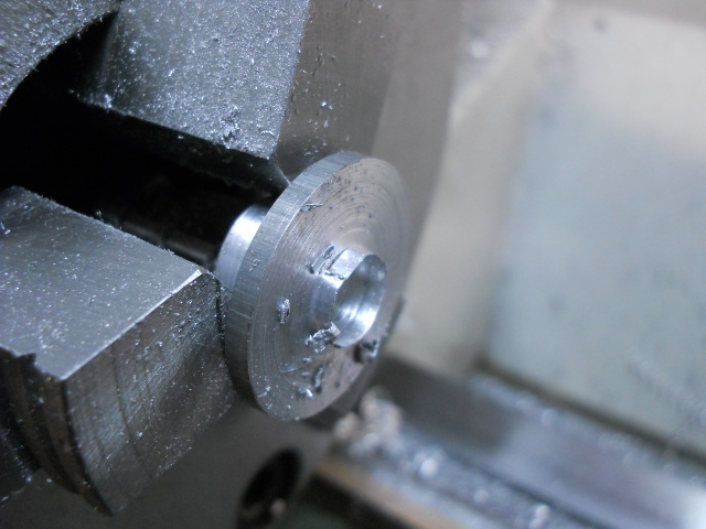 Trotzdem hab ich Bitubos die sich weiterhin weigern ihren Deckel herzugeben (sieht man auf den vorherigen Bildern, da ist noch ein verbogener Stahlstift zu sehen). Da hab ich mir eine Vorrichtung für die Planscheibe meiner Drehbank ausgedacht, wo ich die Federbeinaugen in einstellbaren Kegeln spannen kann. Geführt wird das Federbein dann noch von einer feststehenden Lünette.