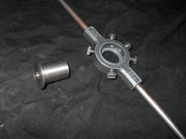 Wenn man sich aus 6mm Rundmaterial so was biegt, ist das kein Problem. Nur dann ein sauberes langes Gewinde mit dem Schneideisen drauf machen, da läuft das Gewinde schnell zu Seite weg. Um das zu verhindern, hab ich mir eine Buchse für den Schneideisenhalter gedreht. Damit geht das dann problemlos, bekommt man aber auch im Werkzeughandel solche Buchsen.