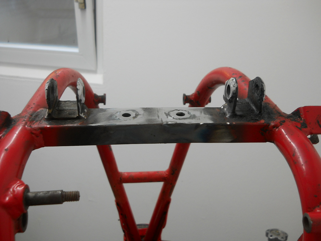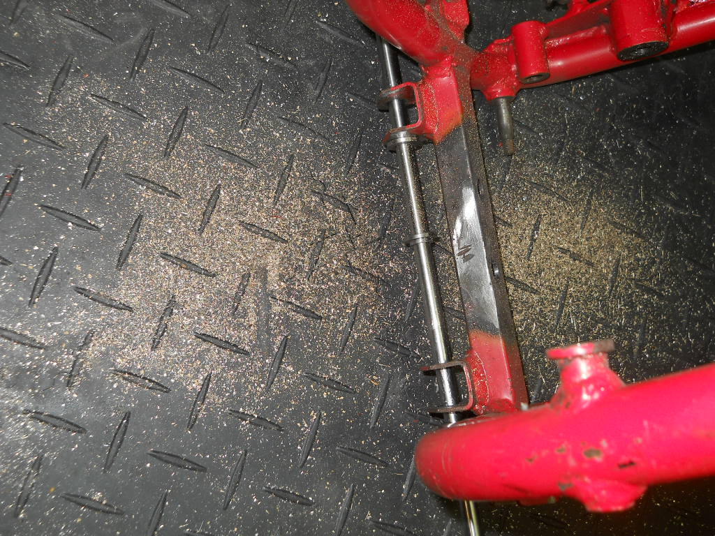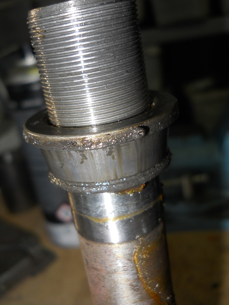 Der Bremshebel stand in Fahrtrichtung gesehen zu weit nach innen, also heiss machen und rausbiegen/kloppen. Dabei bog sich dann aber nicht der Hebel wie geplant, sondern der Bolzen an Hebel. Gut denke ich mir, setz unten am Hebel noch ne Schweissnaht und dreh bzw. Fräs die nachher passend. Dummerweise hatte ich keine so langen passenden Fräser mehr und überhaupt bekam ich keine zentrische Einspannung für das schon teilvermurkste Teil.
