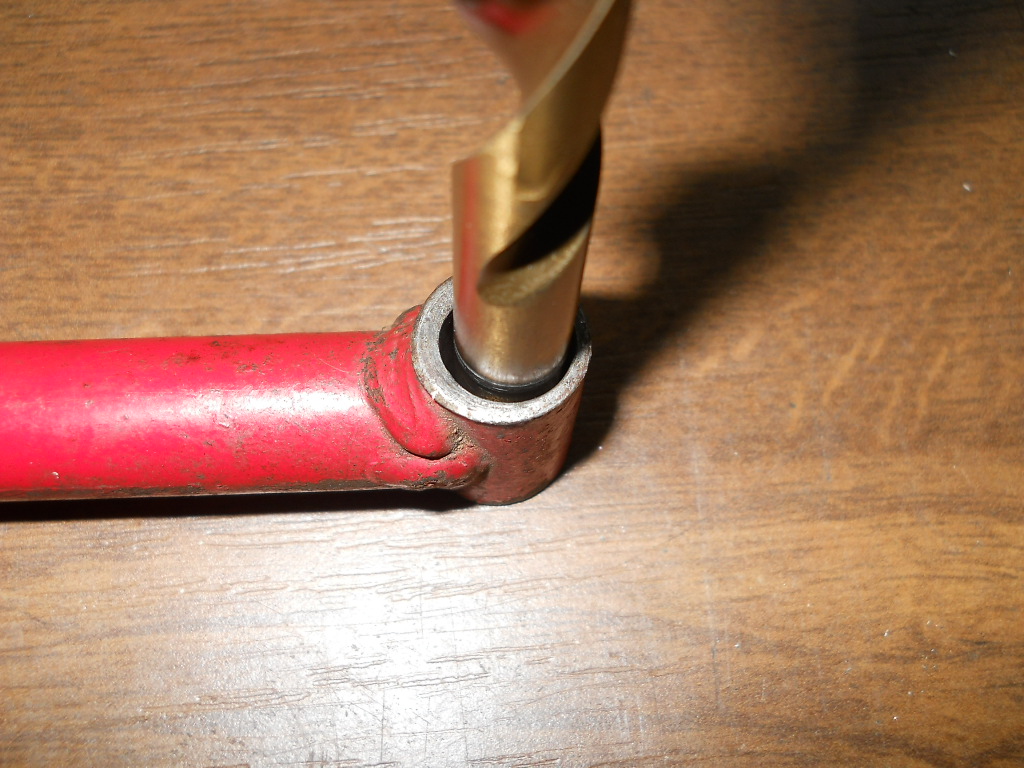 Ursache schnell gefunden, die vordere Aufhängung ist ein wenig ausgeschlagen. Bolzen hat 10mm und hier steckt ein 10mm Bohrer in der Buchse.