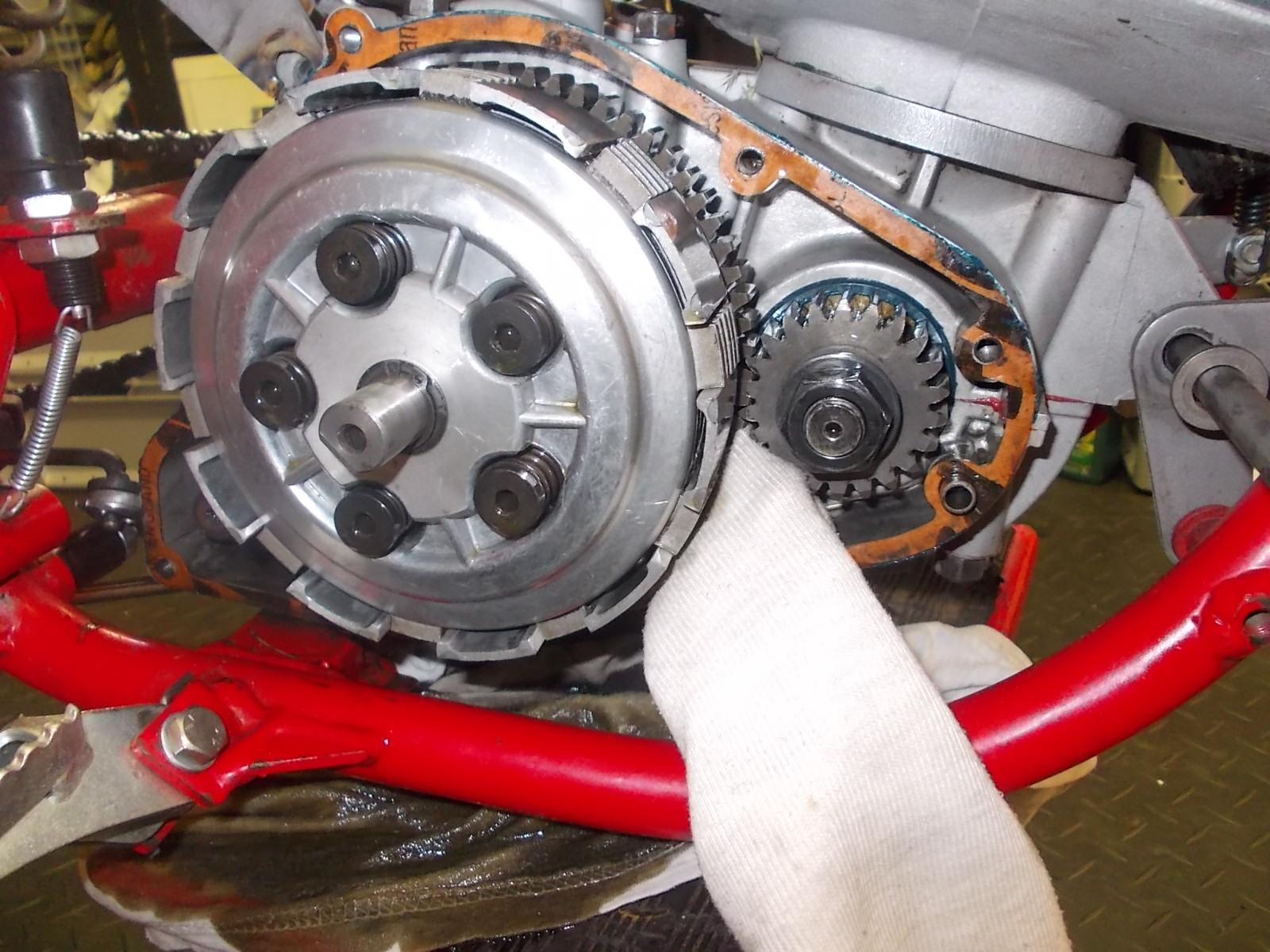 Leider musste ich feststellen, das eine Kupplungsdeckelschraube so blöd sitzt, das man die bei eingebautem Motor nicht am Rahmen vorbei bekommt