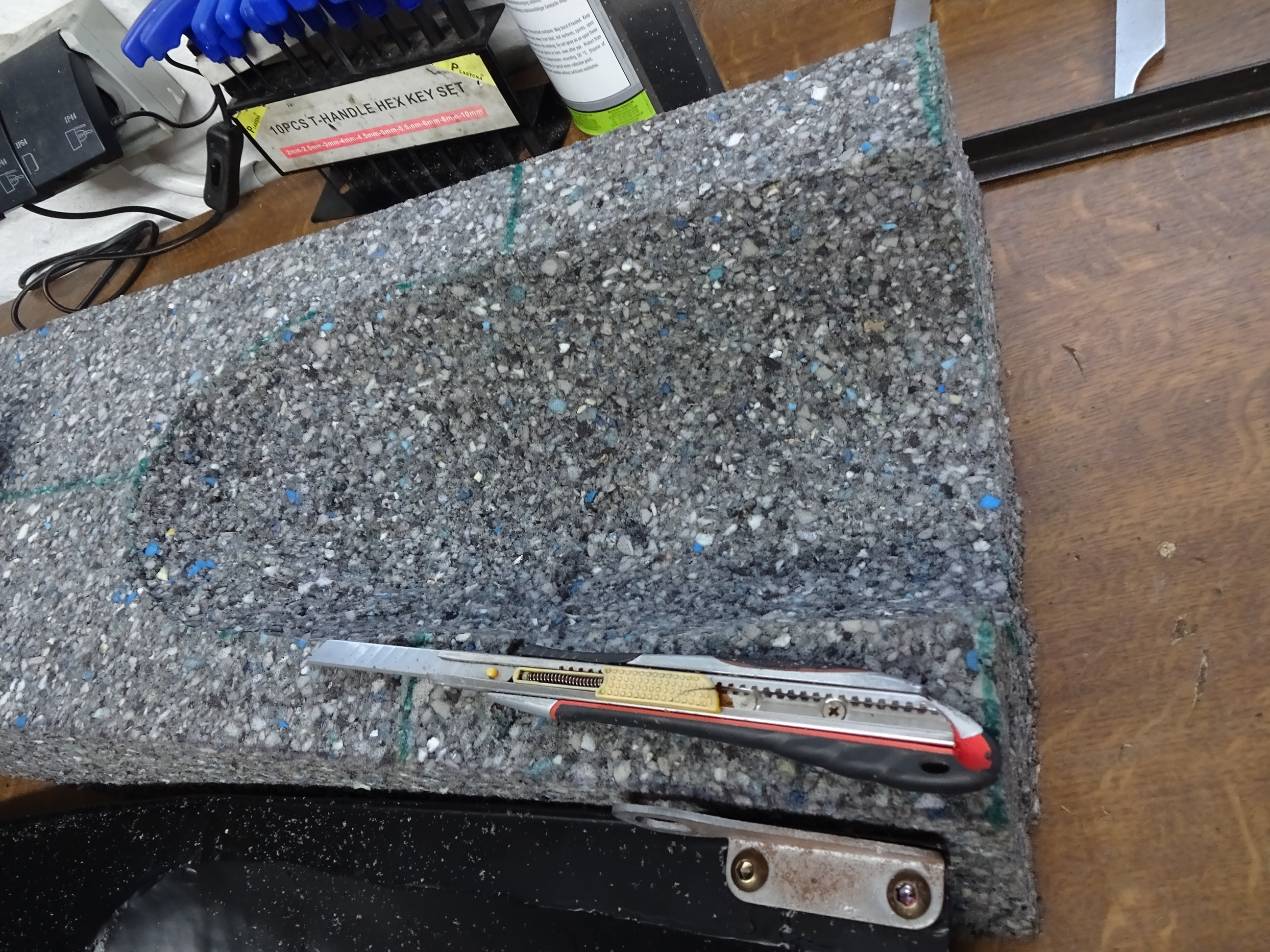 So heute mal losgelegt mit dem Schaumstoff. Alten aufgelegt und ersten Schnitt angezeichnet, das elektrische Küchenmesser war dabei nicht ungeeignet