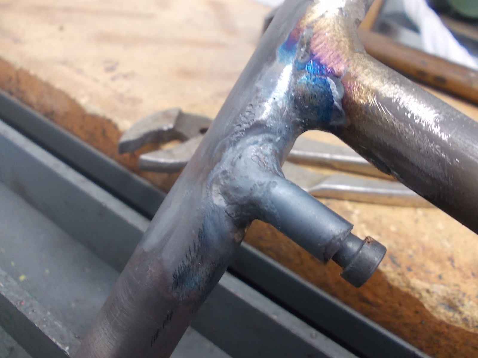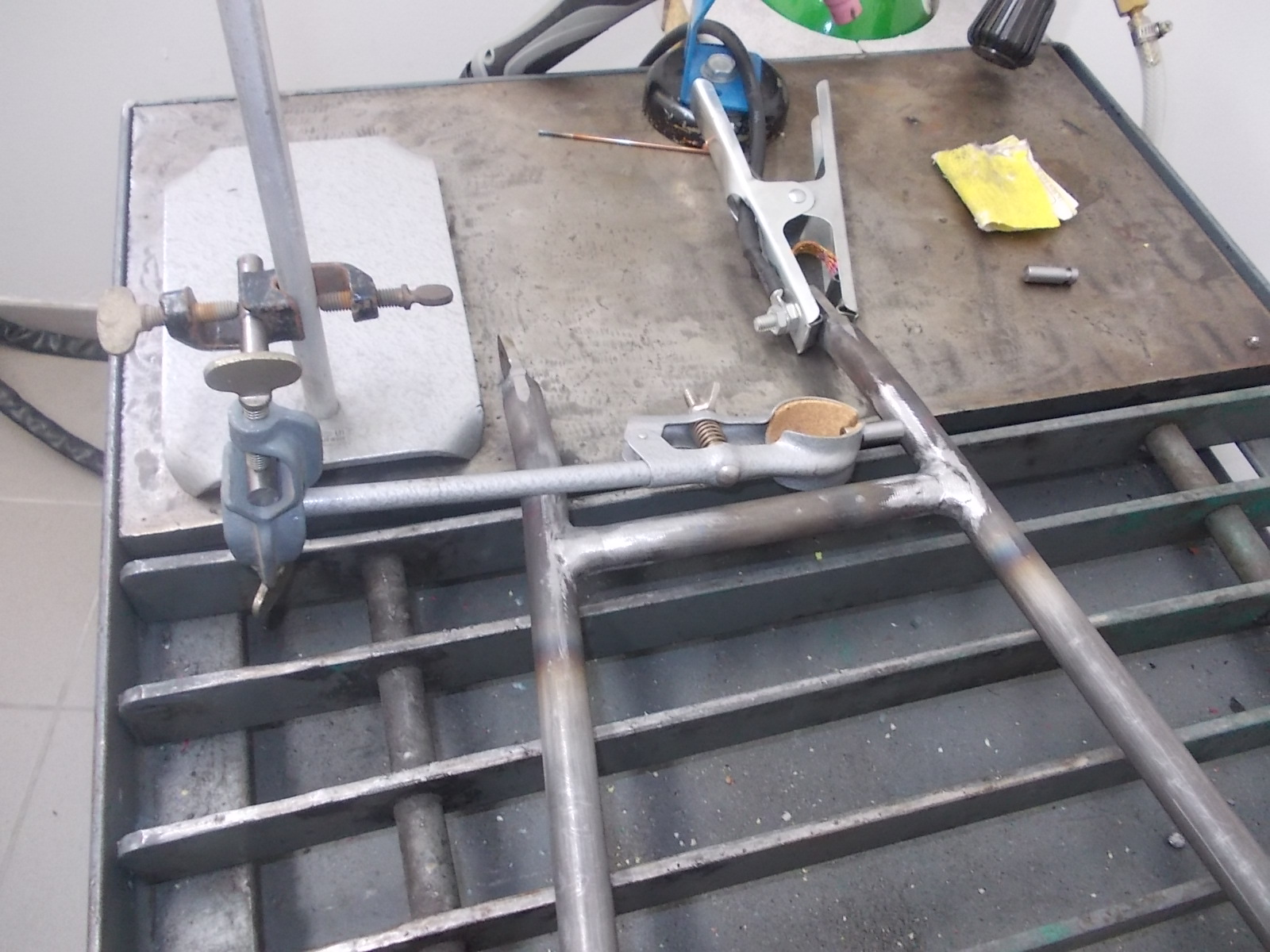 Jetzt hab ich erst mal die Scheißnähte verputzt und dann die Halter für die Federn angeschweisst. Auch hierbei helfen mir die Halter aus dem Laborbedarf echt prima.