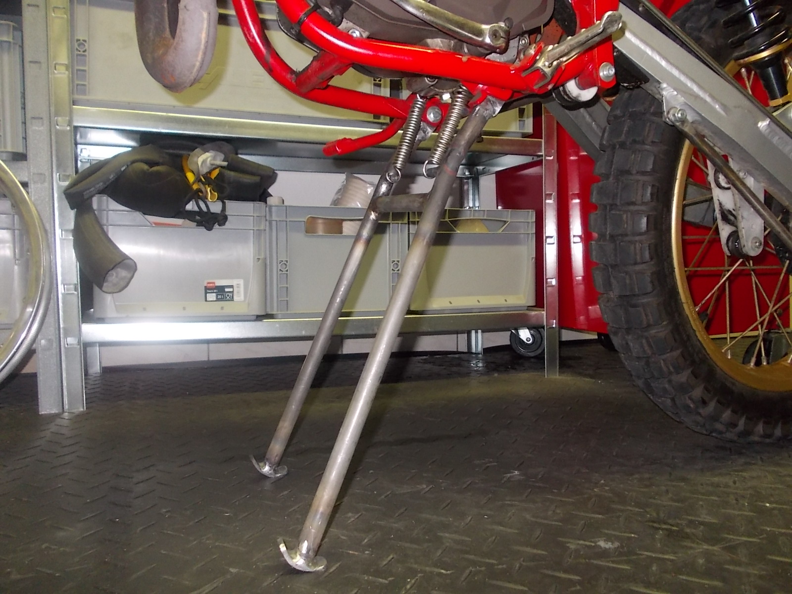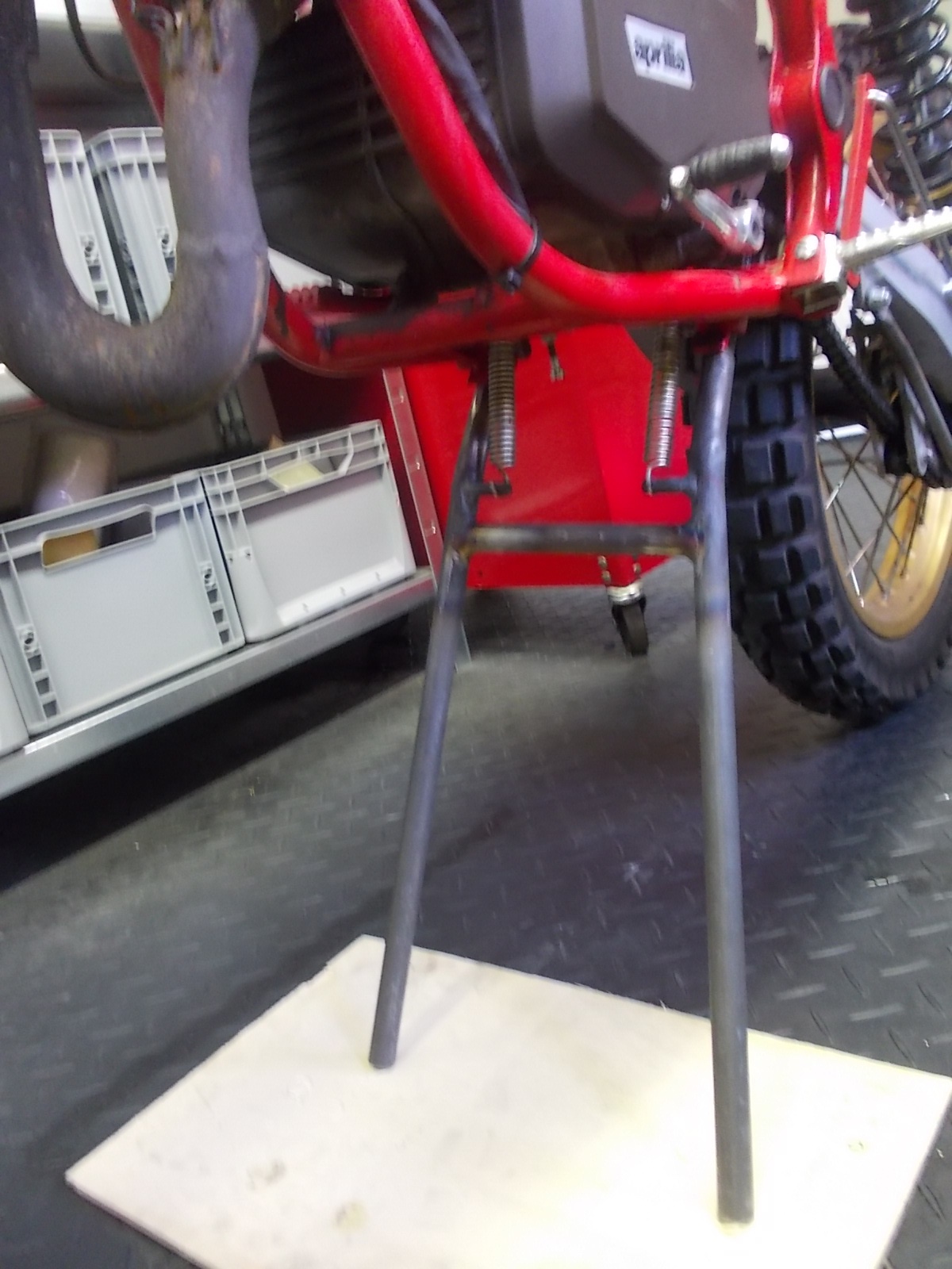 Ich glaube ich muss später noch mal an den Mittelständer. Will versuchen den so hinzubekommen, dass das Moped auf dem Vorderrad steht.