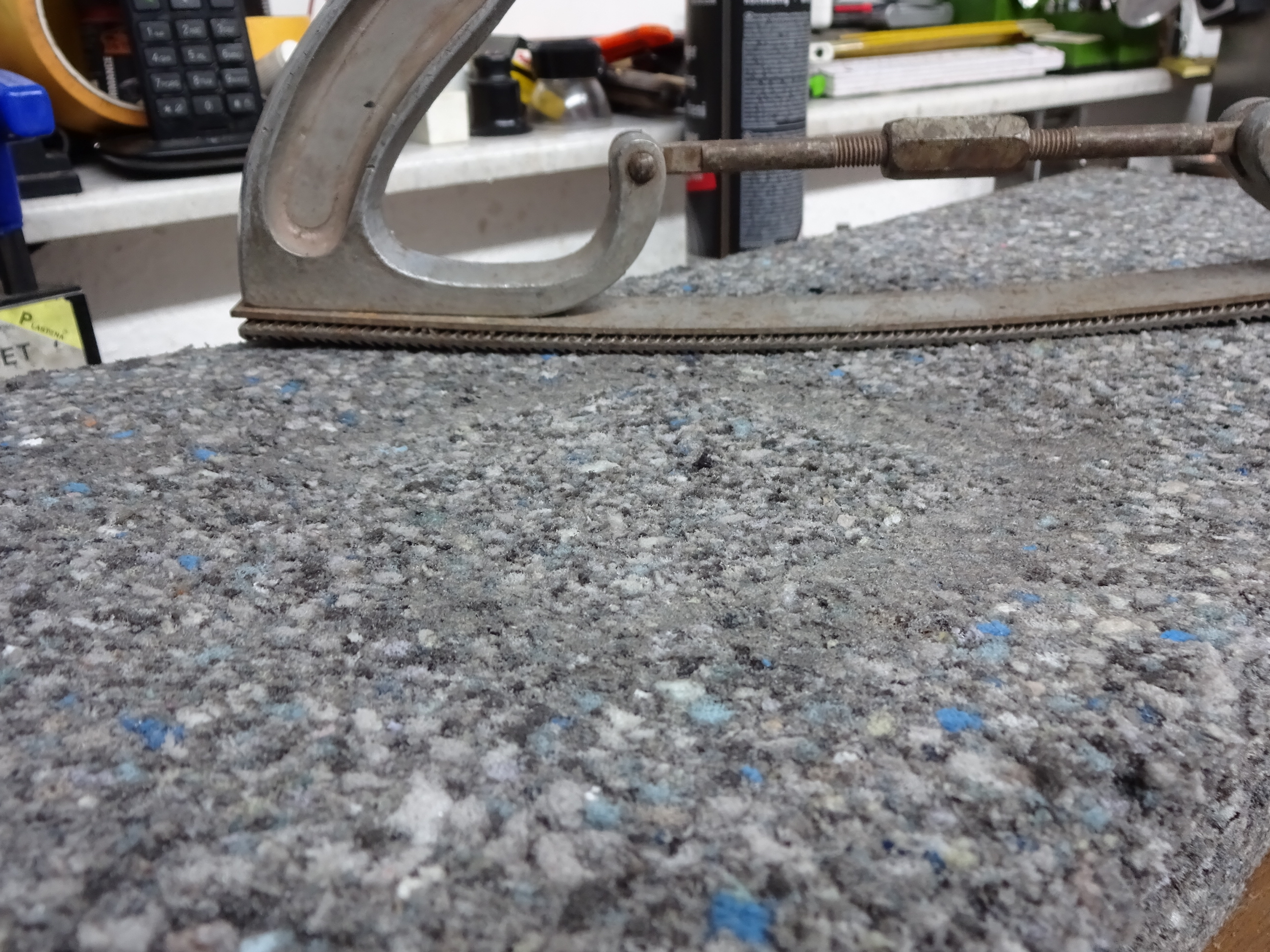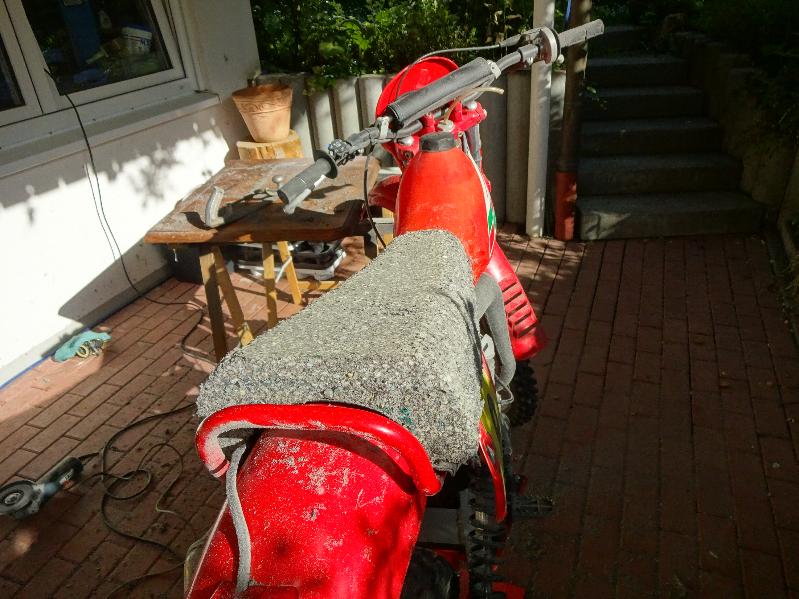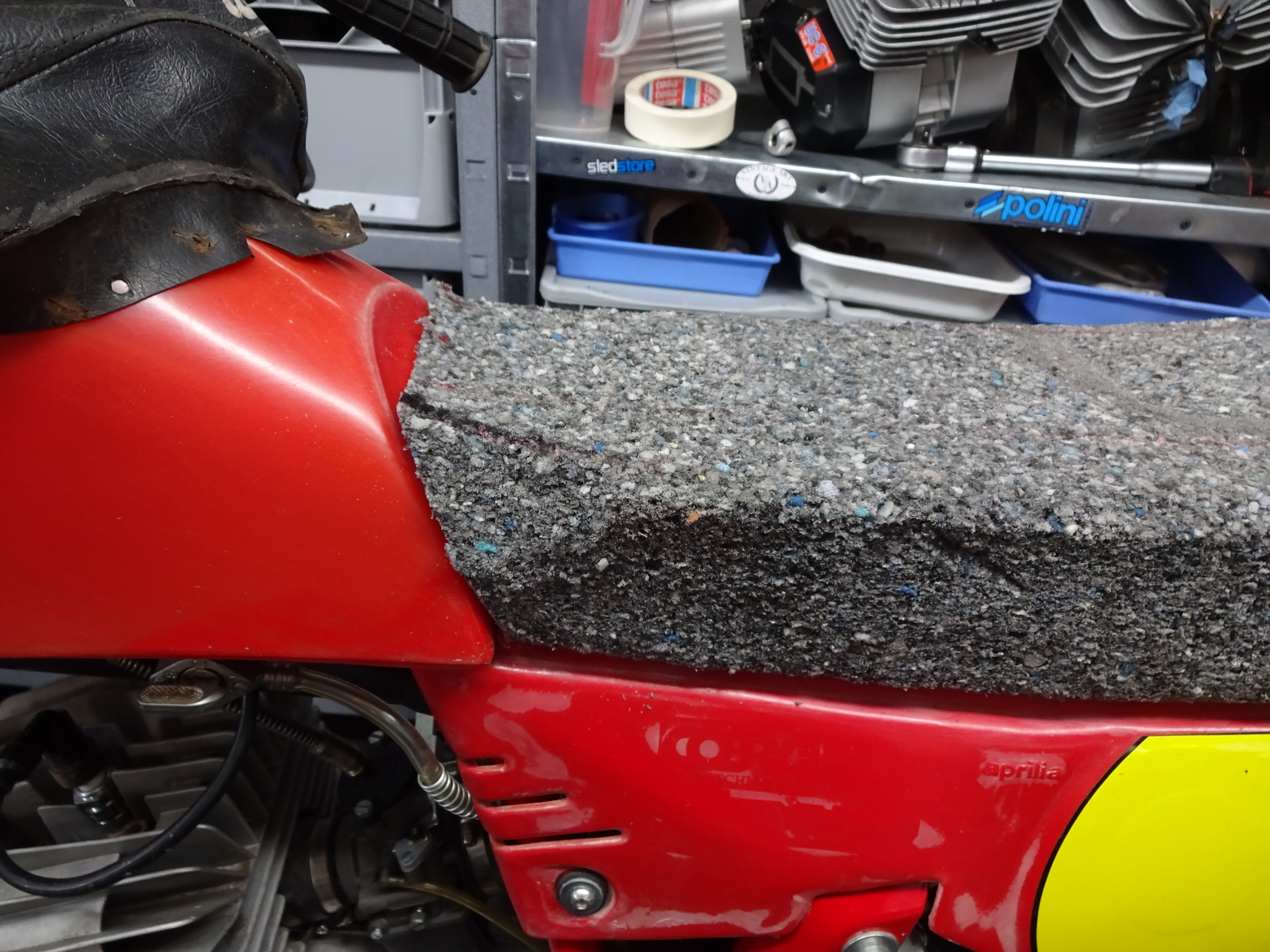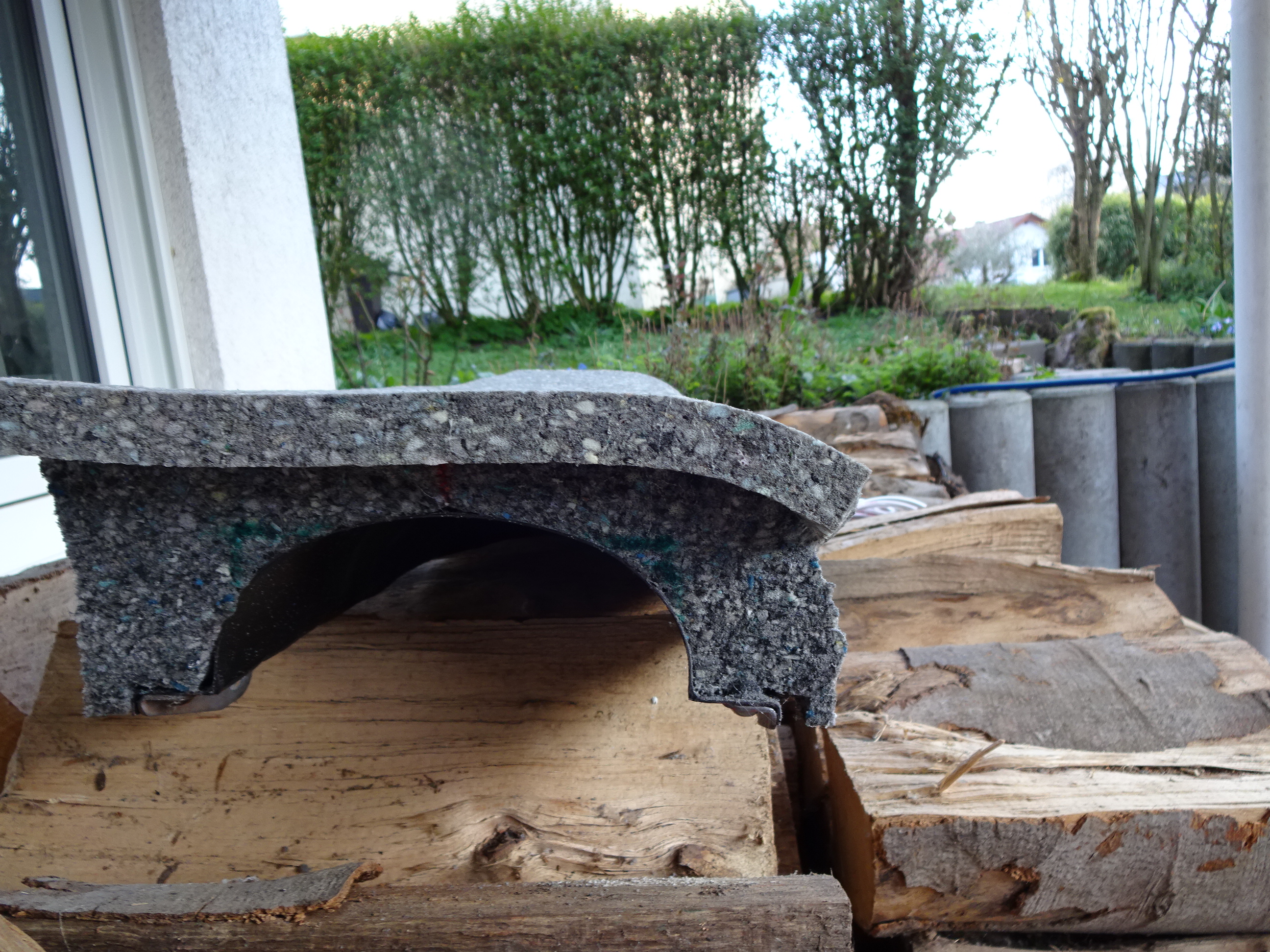 Nach dem Aufkleben des Schaumstoffs suf das Grundgestell zeigte sich (Dank des Superkleber)! Das ich in der Mitte zu viel weggenommen hatte, es entstand eine tiefe Delle