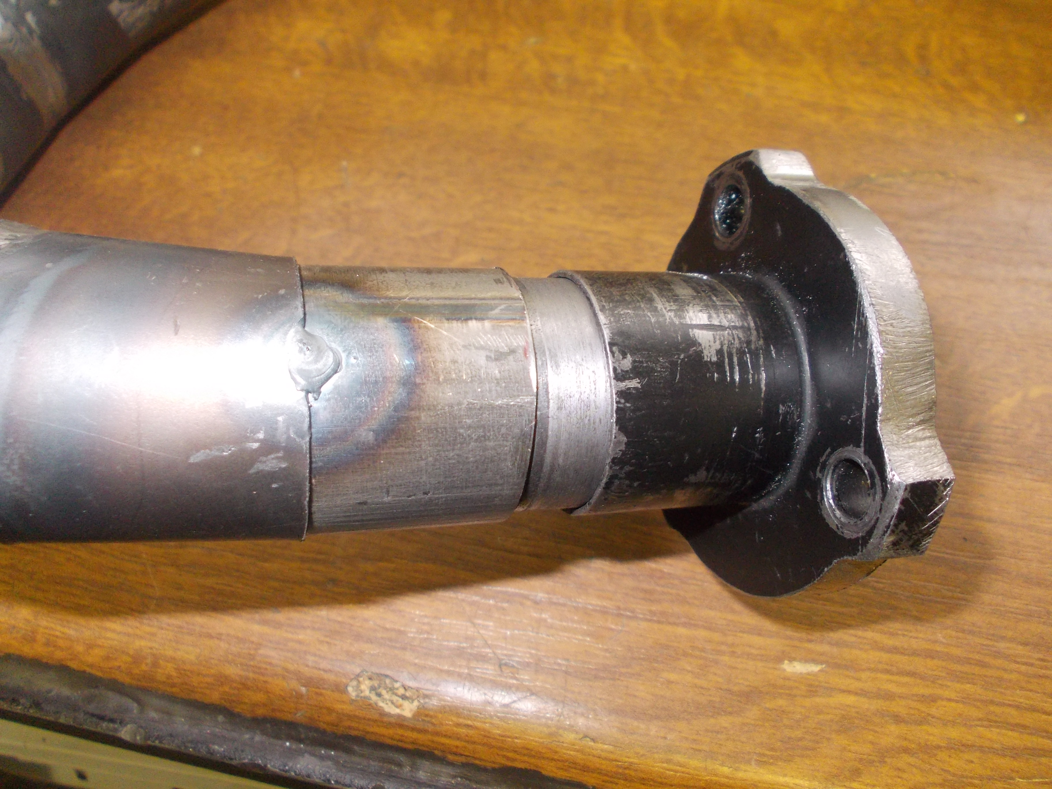 Zusätzlich hab ich mir noch ein Eisen passend gedreht, damit ich den Krümmer auf dem Auspuffstutzen mit leichter Klemmung schieben konnte. Nach zig mal dran und wieder ab, hab ich angefangen Heftpunkte zu setzten.