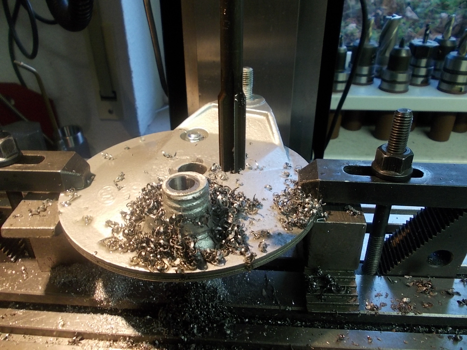 Jetzt kam der schrecklich ausgeleierte Magnesium Bremsdeckel von Hans Joachim an die Reihe. Der musste unter die Fräse und erst mal rund ausgespindelt werden. Um nicht zu viel Material zu entfernen, mussten wir aussermittig arbeiten und dadurch später die Buchse auch aussermittig bohren. Nachdem das Mass für die Buchse feststand, diese mit Bund erst mal gedreht. Da wir uns nicht trauten eine Buchse in einen Magnesiumdeckel zu pressen (Rissgefahr) musste diese erst mal mit Lager und Buchsenkleber eingeklebt werden. Mache das Teil wohl morgen fertig, dann kann ich auch Bilder davon machen.