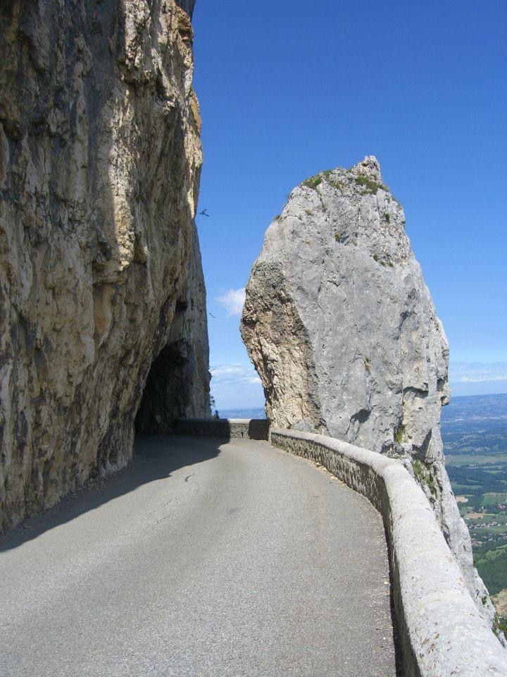 Die in den Felsen gehämmerte Straße ist die Route de Combe Laval bei Grenoble.