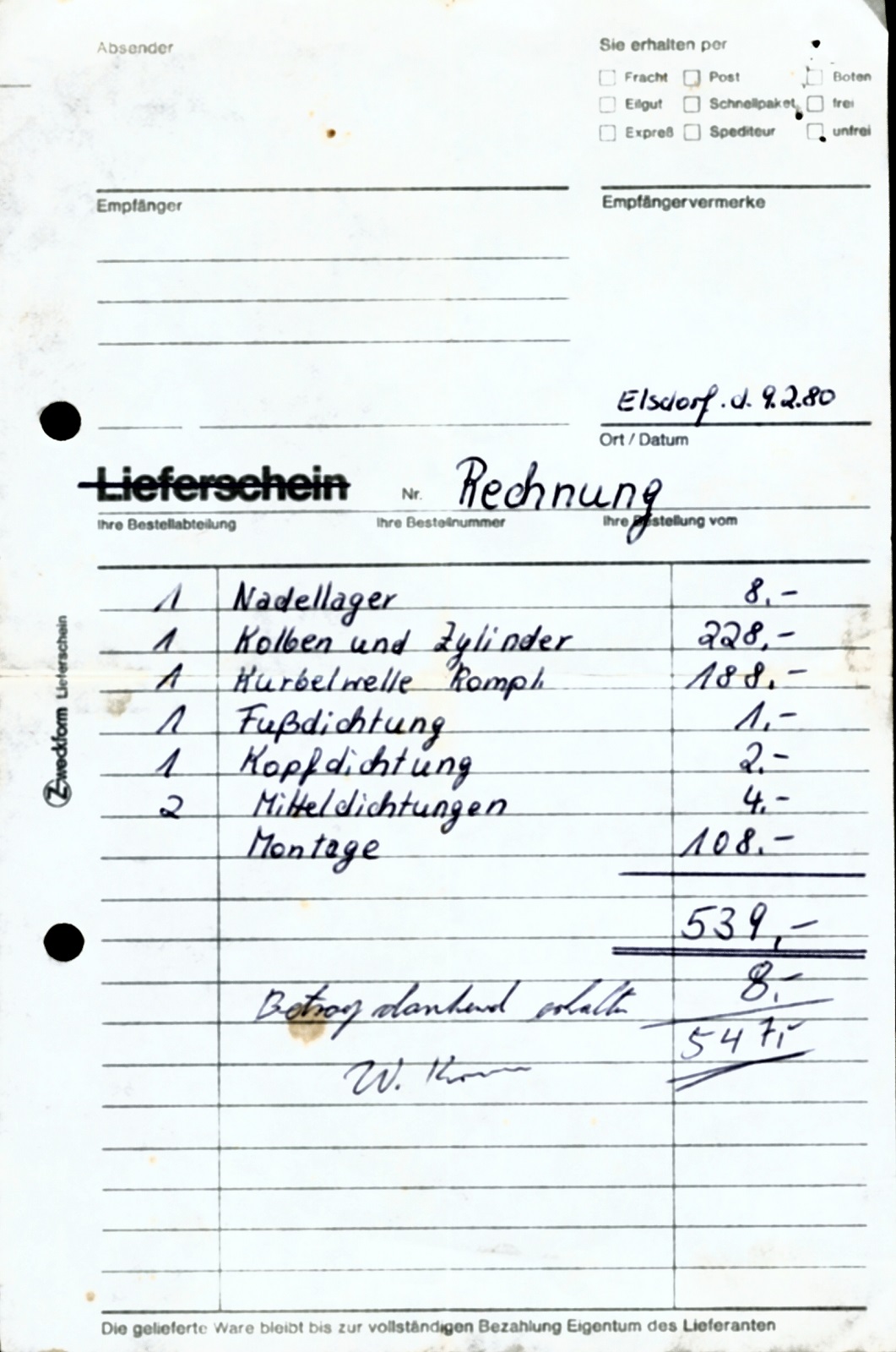 Da ist auch ein komplett Karton bei gewesen: Zylinder, Kolben, Auspuffstutzen und Dichtungen. Steht 230 DM drauf!