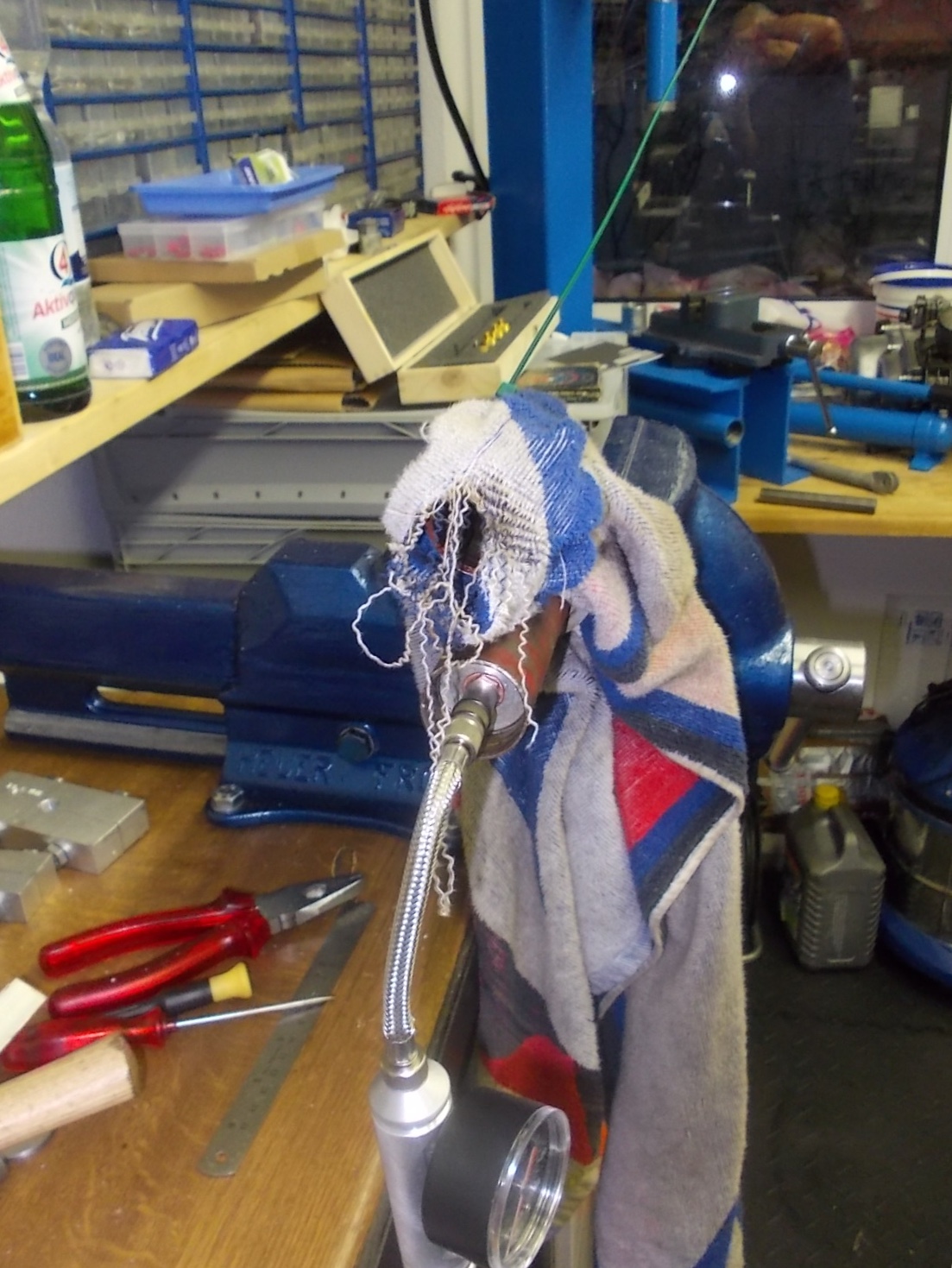 Dann Schraube in das Ventilgewinde schrauben und in den Schraubstock. Ich musste aber erst noch die Wand oberhalb des Deckels gut schmirgeln, sonst ging der Deckel nicht drüber.