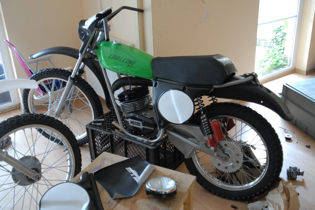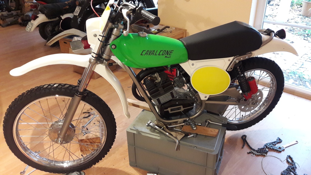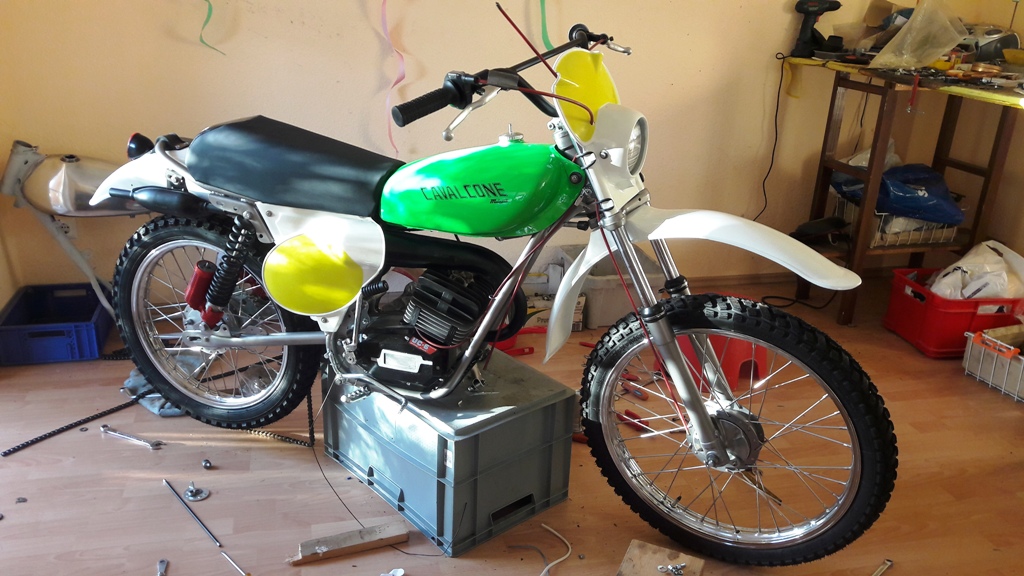 Malaguti, alte Liebe. Ich war Ronco-Fahrer, allerdings ist die Cavalcone aus den 70ern die schönste von allen - wie ich finde (hat ein wenig von Ancillotti). Nach den Aspes-Restaurationen habe ich mir meine persönliche Mala zusammengestrickt. Dabei sind Jahre ins Land gezogen. Originalteile gesucht, aber nicht Originalbaujahr und Farbe und Motor. Man möge mir verzeihen. Rahmen BJ 78 mit Ori-Gutachten ohne Vergasereintrag. Schwinge Chopper, BJ81, hatte nichts anderes. Habe ich erst beim Zusammenbau festgestellt. Zu breit – Nase für Bremsanker verlängert. Passt. War ärgerlich, auch der Auspuff hat sich gewehrt, ging aber auch dann. Stoßdämpfer alte Marzocchi (passt gar nicht in die BJ, aber schön), 6-Gang-Motor mit 70ccm und 19er, kontaktlose Zündung. Grün musste der Tank werden. Alles andere ergab sich, ein Kampf, wie sich herausstellen sollte. Letztlich wurde es der 79er Tank (zu faul, um separate Entlüftung dran zu machen), die älteren haben eine separate Entlüftung, sehen aber sonst genauso aus, die 79er Bank (habe kürzlich noch eine gaaannz seltene Ein-Mann-Sitzbank gefunden, Foto), die 78er Zwei-Mann-Sitzbank ist zu eckig für meinen Geschmack, dann bin ich von schwarzem Plastik auf weißes umgeschwenkt. Sieht besser aus. Auch die kleinen Deckel (78) sind gefälliger als die großen 79er. Kotflügel 78er mit Aprilia-Rücklicht, Maske nicht original, aber ähnlich, Licht 79er Modell (Schalter am Scheinwerfer), 78er Modell hat Aprilia-Schalter am Lenker und Aprilia-Scheinwerfer. Domino-Hebel mit Rädchen (schön, aber nicht Ori soviel ich weiß), einige NOS-Teile: Rasten, Bremshebel, Kettenspanner. Habe auch San Remo-Felgen gefunden (sehr selten). Sollten erst Akront werden. Aber seht selbst die Verwandlung. Die Kleine wird höchst wahrscheinlich Deko werden oder vielleicht im Frühjahr wachgeküsst. Zündfunke alles da. Mal sehen. Fehlen nur noch Kette und Züge. Euch was aufgefallen? Ja. Mir am Ende auch. Ich habe intuitiv die Farben der italienischen Flagge gewählt. Warum nur? Vielleicht ist sie auch ein wenig zu bunt geraten. Egal, mir gefällt´s. Ein paar unsortierte Bilder von der Entstehung.