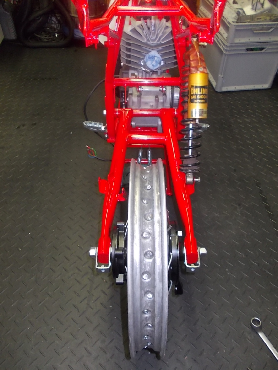 Dem aufmerksamen Betrachter entgeht natürlich nicht, das der Motor noch nicht richtig fest ist (passende Schraube hole ich morgen noch). Weiterhin kann man sehen, dass die Schwingenachse gut gefettet ist