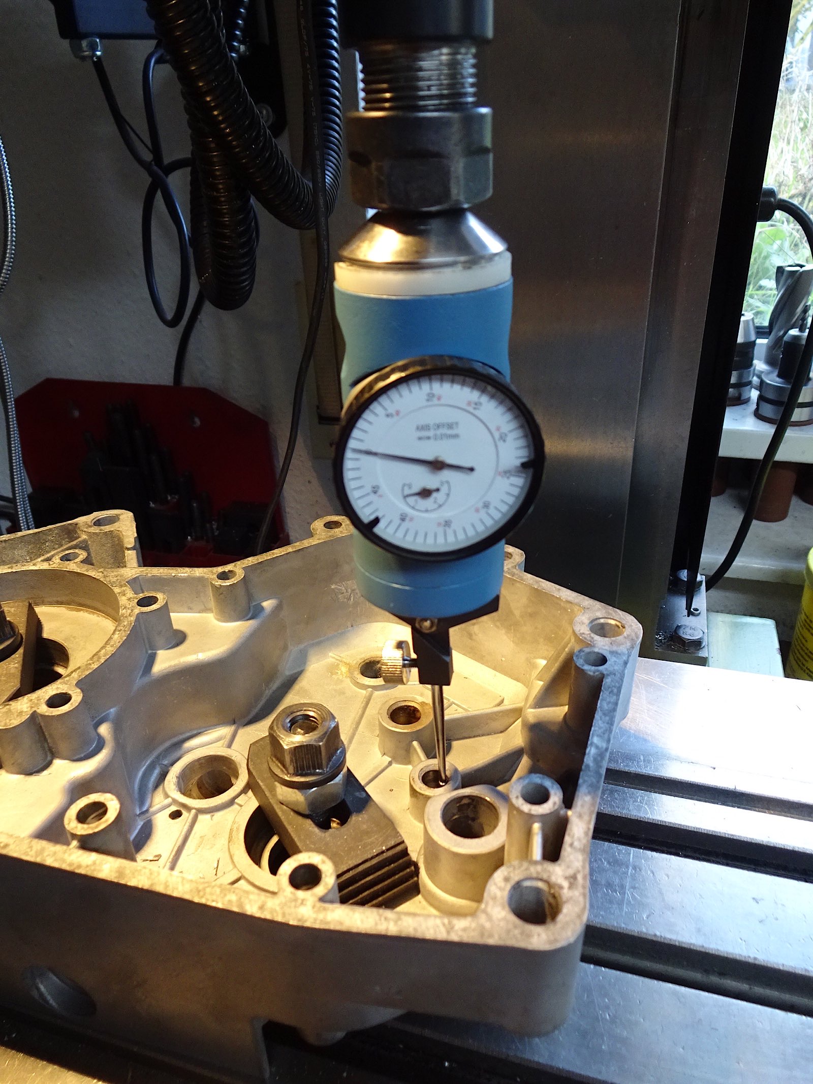 Jetzt konnte die Platte auf das geschweisste Gehäuse gesetzt werden und selbiges wurde zentriert. Leider kam ich mit meinem Ausdrehkopf nicht tief genug. So musste ich mich mit meinen 0,1mm Abstand Bohrersatz vorsichtig rantasten, ging aber ganz gut.