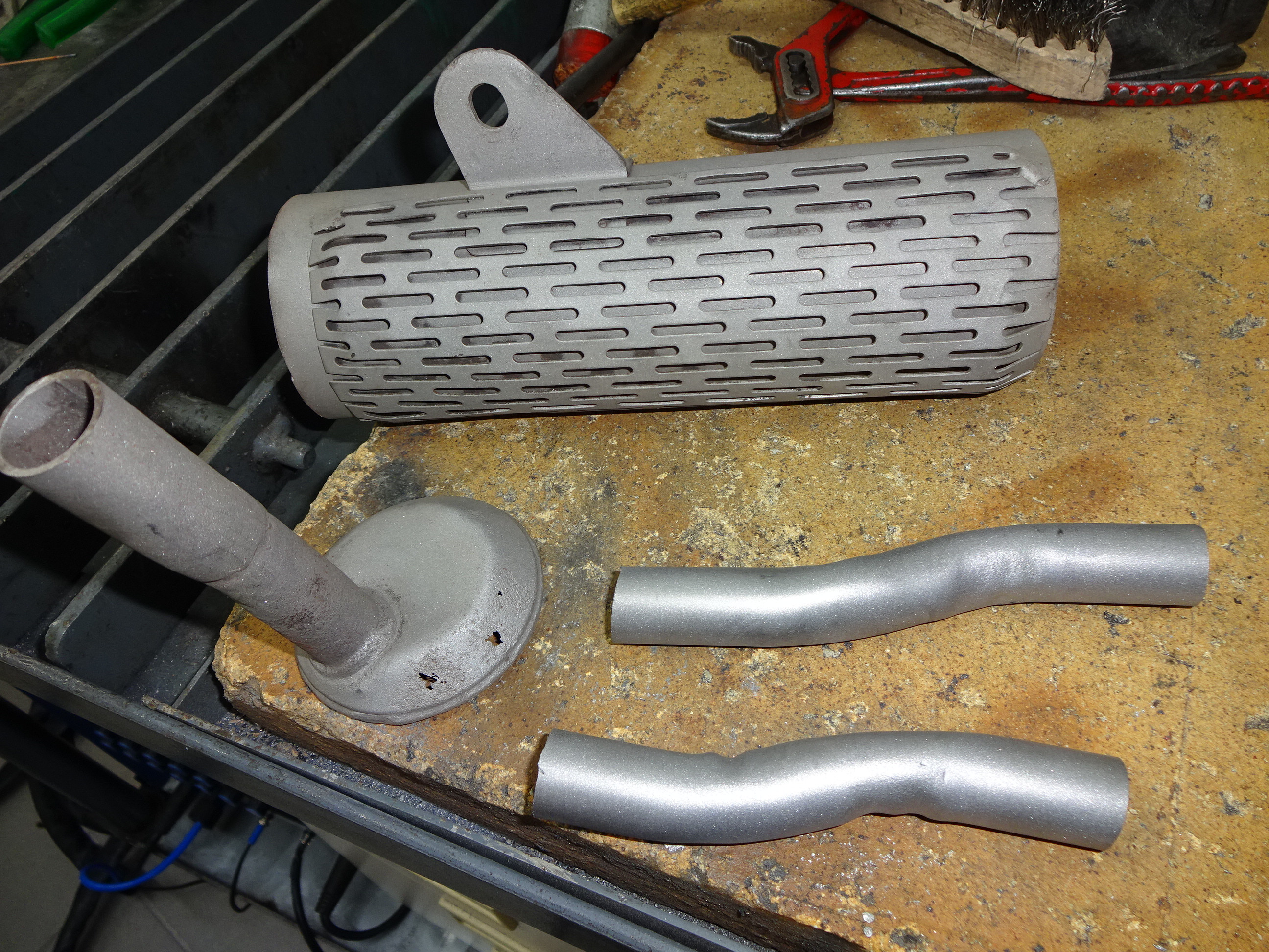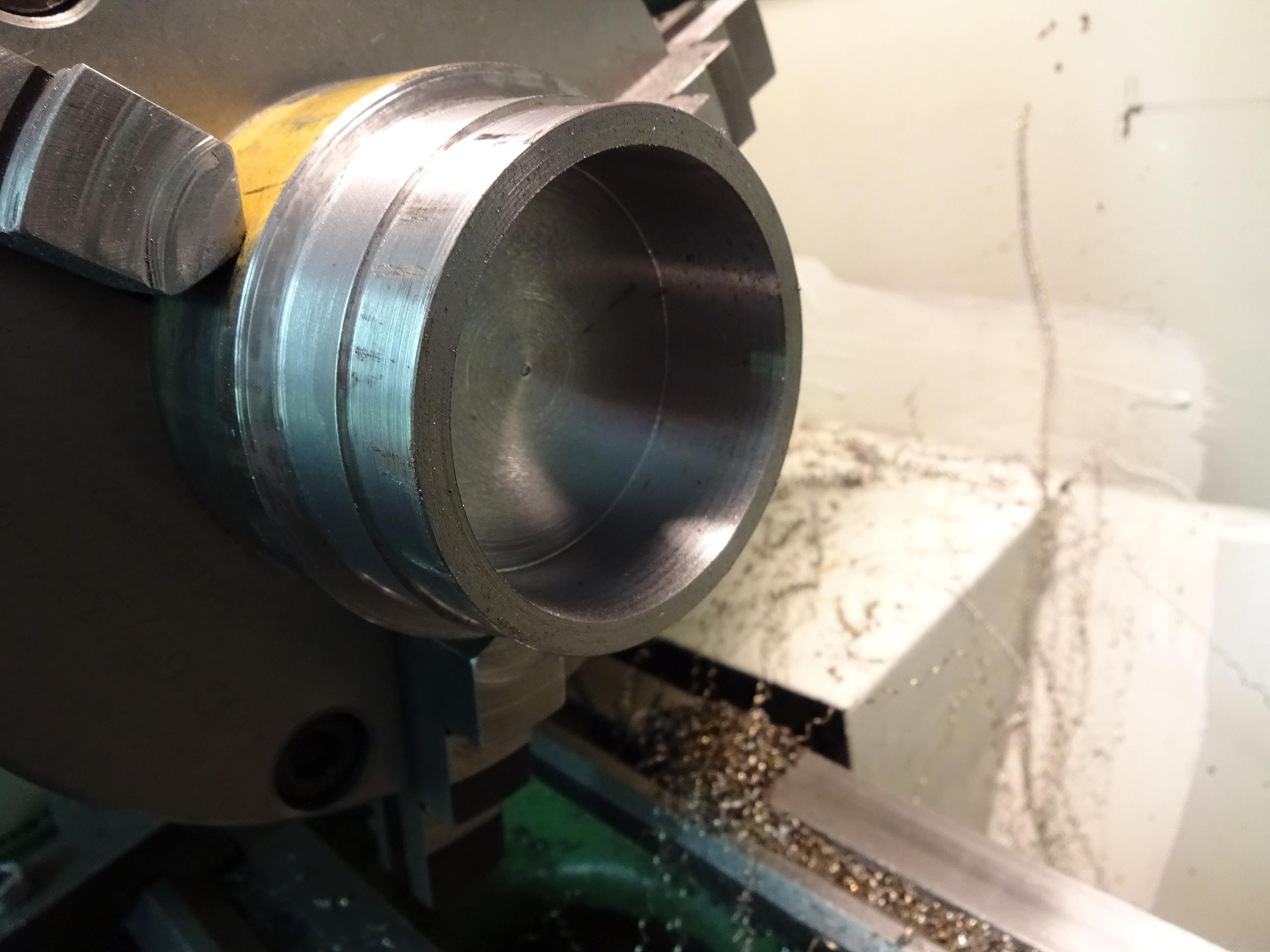 Hier ist eine Seite (welche nachher im Dämpfer verschwindet) schon bearbeitet. Die Kratzer kommen durch die Innenseite des Schalldämpfer. Der Steg bleibt so dick, damit genug Fleisch für das Gewinde von 1 oder 2 Halteschrauben ist.