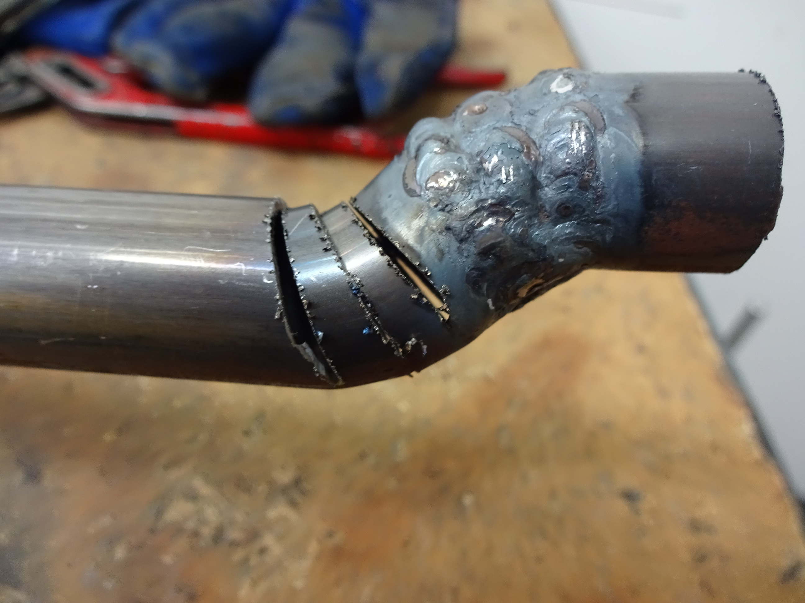 Mist! Ne Unterlage gedreht das ich die beiden Teile positionieren konnte und die Aussenseite erst verschweisst und dann zu tiefe Stellen noch aufgefüllt. Hier sieht man den sauberen Durchbrand der Schweissnaht.