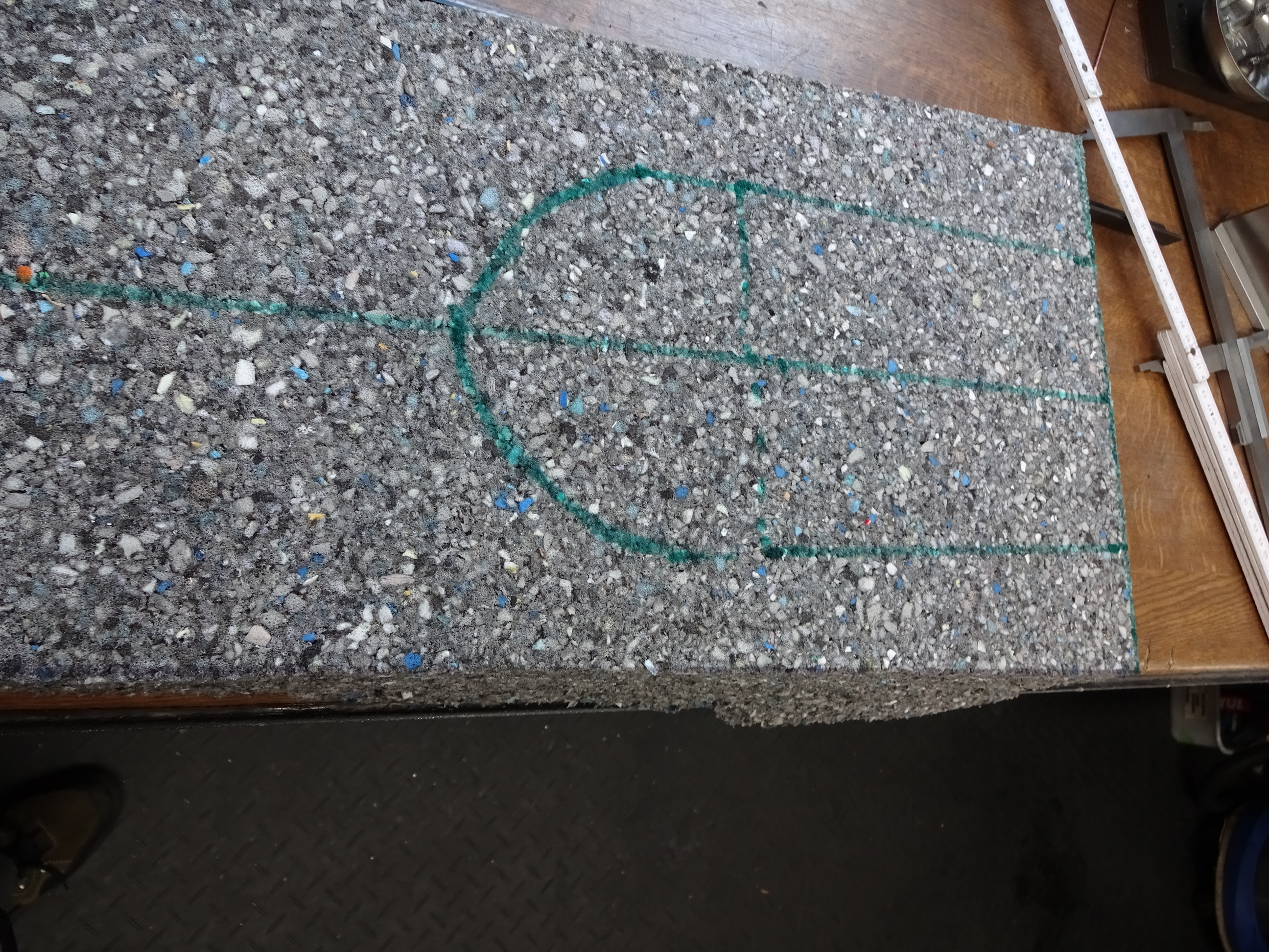So heute mal losgelegt mit dem Schaumstoff. Alten aufgelegt und ersten Schnitt angezeichnet, das elektrische Küchenmesser war dabei nicht ungeeignet