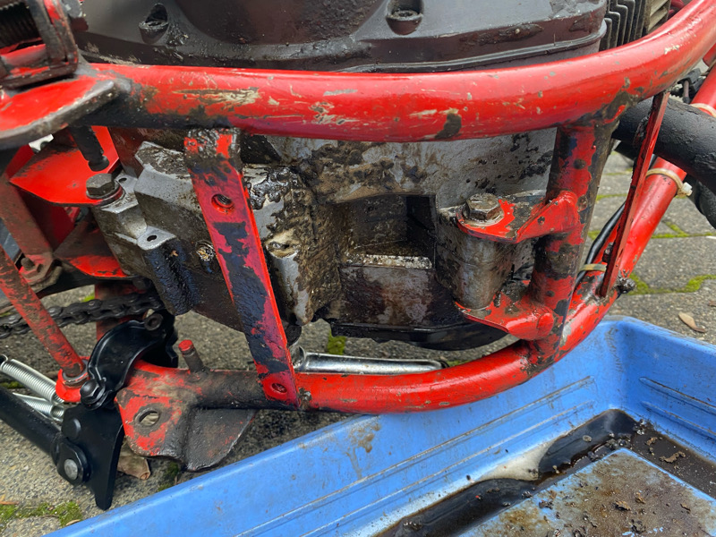 Hinter die Seitenteile habe ich noch nicht geschaut wegen des Luftfilterkastens. Das Gummi zwischen Vergaser und Lufi-Kasten fehlt.