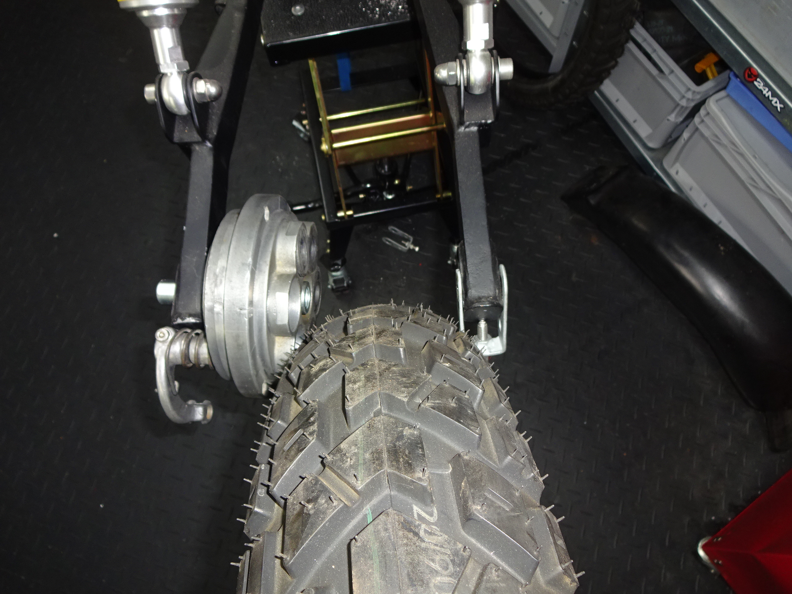 Jetzt geht das prima, alles zusammenstecken und von rechts die Achse durch Buchsen und Nabe stecken. Dann von links das kurze Achsstück inkl großer Mutter einsetzen und zusammenschrauben