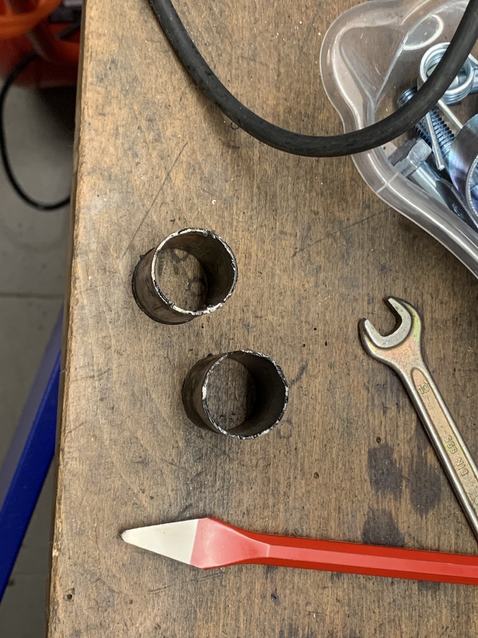 Aktuell beim Zusammenbau, die Schwinge wurde statt mit diesen Messingbuchsen mit originalen Silentbuchsen bestückt, Lenkkopflager erneuert, revidierte Gabel mit Vorderrad ist drin, der Rest geht nun hoffentlich deutlich zügiger voran.