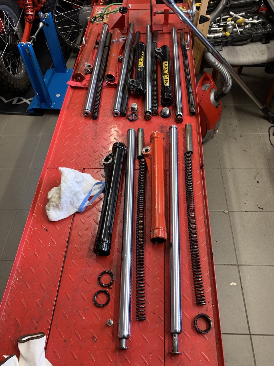 Felgen entspeicht, Gabeln zerlegt, alle Teile dann zum Entlacken/Strahlen und zum Pulverer meines Nichtvertrauens gebracht, überwiegend mehr als bescheiden geworden, also nochmals fast alles von vorne, diesmal beim Pulverer meines Vertrauens. Nun alles perfekt, natürlich zeitverzögert und unnötiges Lehrgeld bezahlt!!! Keine Ahnung warum ich einen solchen Schwachsinn gemacht habe…
