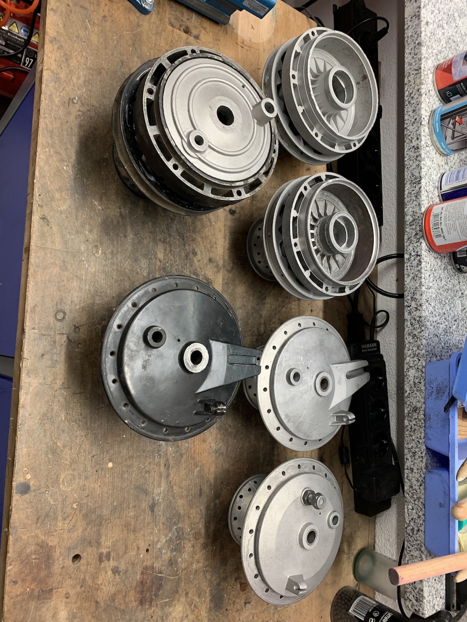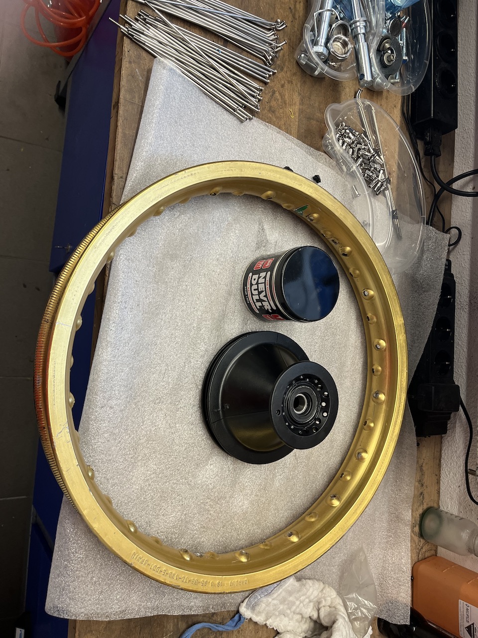 Felgenringe wurden gesäubert und mit Never Dull bearbeitet, neue Edelstahl Speichen bei SWC besorgt, und mit den frisch gepulverten und neu gelagerten Halbnaben eingespeicht. Deutliche Preiserhöhung der Speichen feststellen müssen.